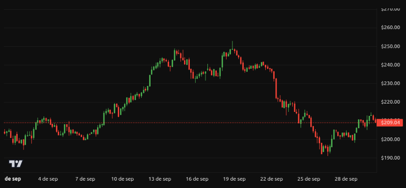 La IA de Musk ubica a Solana como la tercera gran protagonista. En septiembre, su precio se movió entre 190 dólares y 250 dólares, con un promedio de 208 dólares y una caída del 5% en la última semana. A pesar de su historial de caídas técnicas, el activo se ha destacado por la adopción en DeFi e institucional.