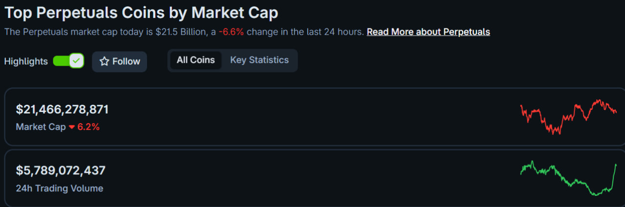 Los datos de CoinGecko muestran que las monedas Perp cayeron un 6,2% (o 1,35 mil millones de dólares) de su valoración en las últimas 24 horas a 21,47 mil millones de dólares en el momento de la publicación.
