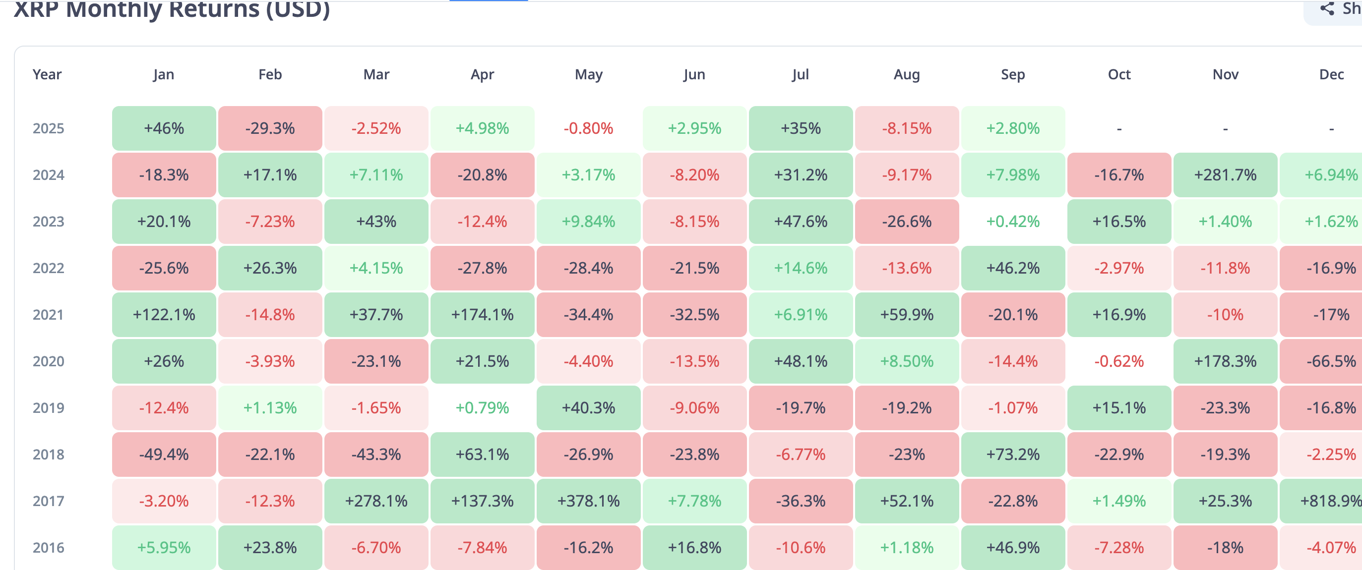 Sin embargo, según los datos de CryptoRank, $XRP está en camino de terminar septiembre con ganancias marginales de aproximadamente 2.76%. La tabla a continuación muestra que $XRP ha registrado ganancias en tres septiembres consecutivos, con las mayores ganancias del 46% en 2022.