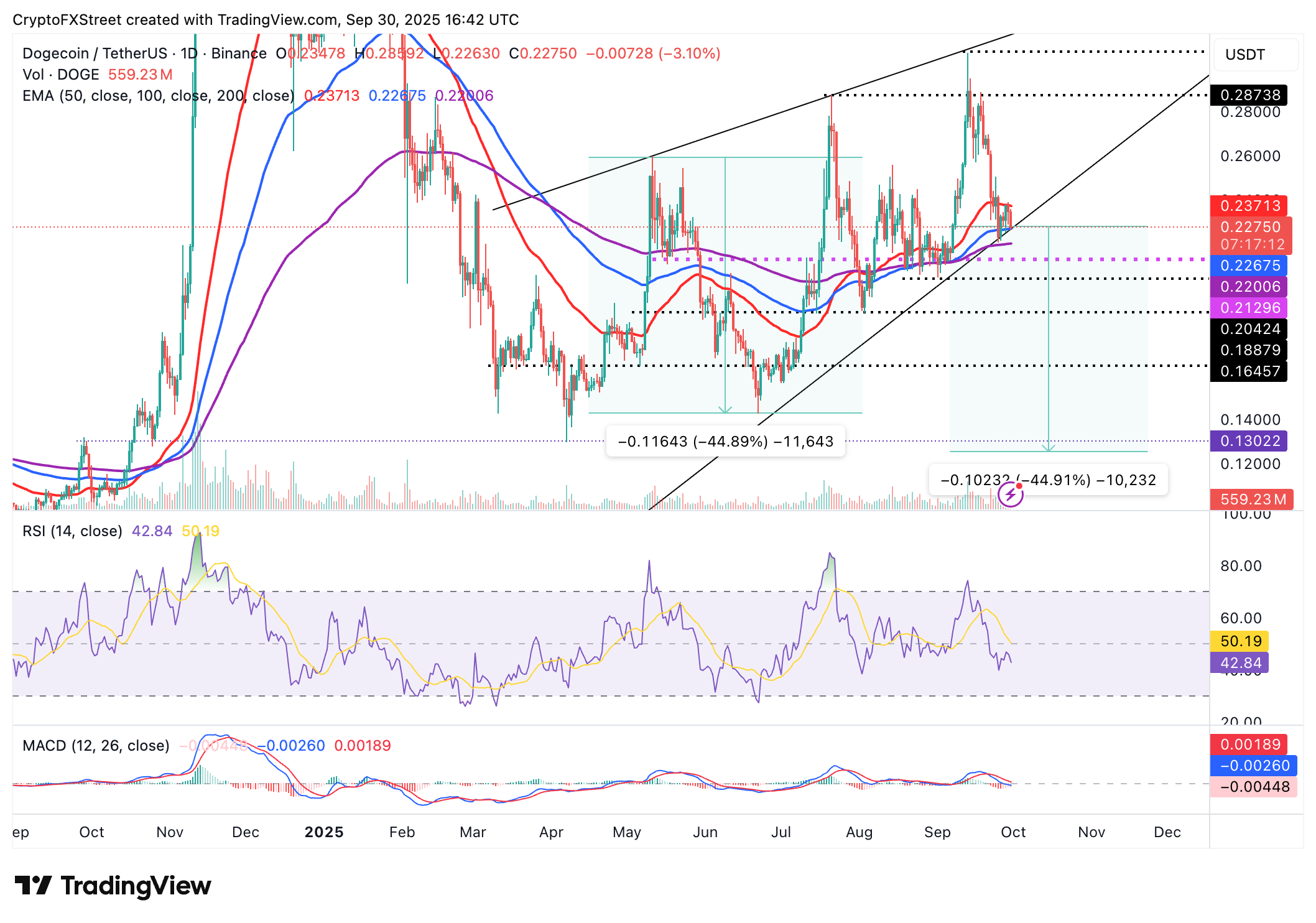Dogecoin (DOGE) enfrenta una estructura técnica debilitada, cotizando por debajo de 0.2300$ el martes. La perspectiva bajista a corto plazo de la moneda meme refleja un sentimiento inestable en el mercado de criptomonedas más amplio antes de octubre.