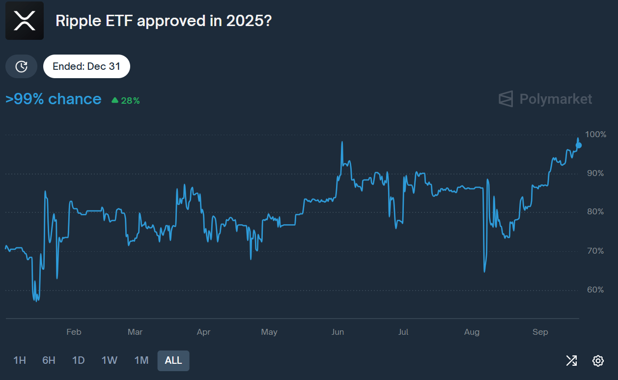 En Polymarket, las probabilidades de que se apruebe un ETF de XRP antes de fin de año rondan el 100%, incluso tras el cierre del gobierno estadounidense.