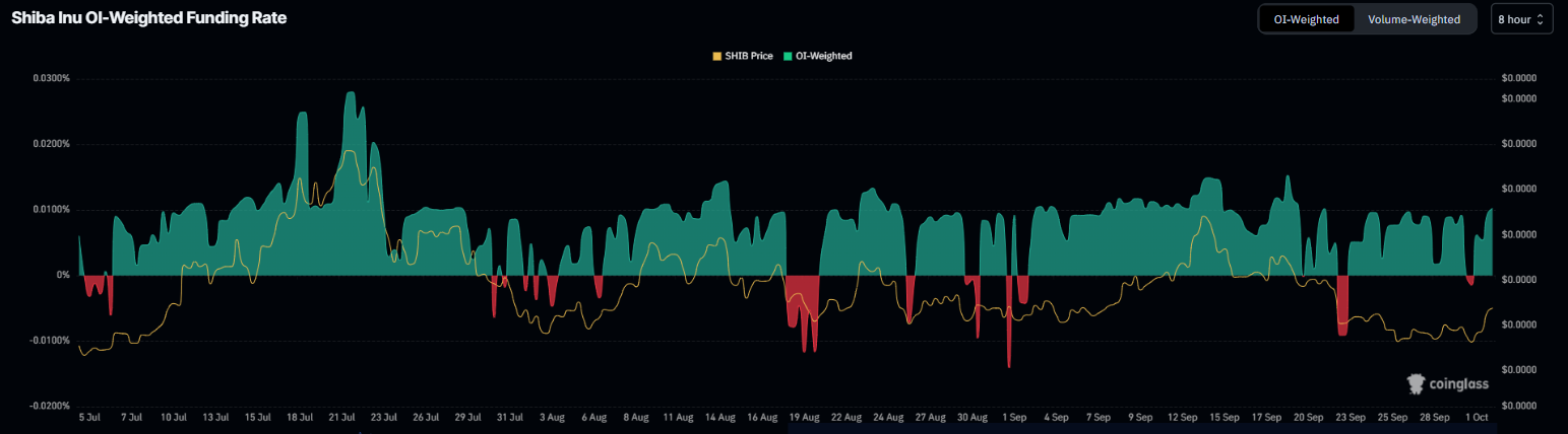 Los datos de Tasa de Financiamiento Ponderada por OI de CoinGlass para SHIB muestran que el número de operadores que apuestan a que el precio de la moneda meme SHIB caerá más es menor que el de aquellos que anticipan un aumento de precios. Generalmente, una tasa positiva (los largos pagan a los cortos) indica un sentimiento alcista, mientras que los números negativos (los cortos pagan a los largos) indican bajismo.