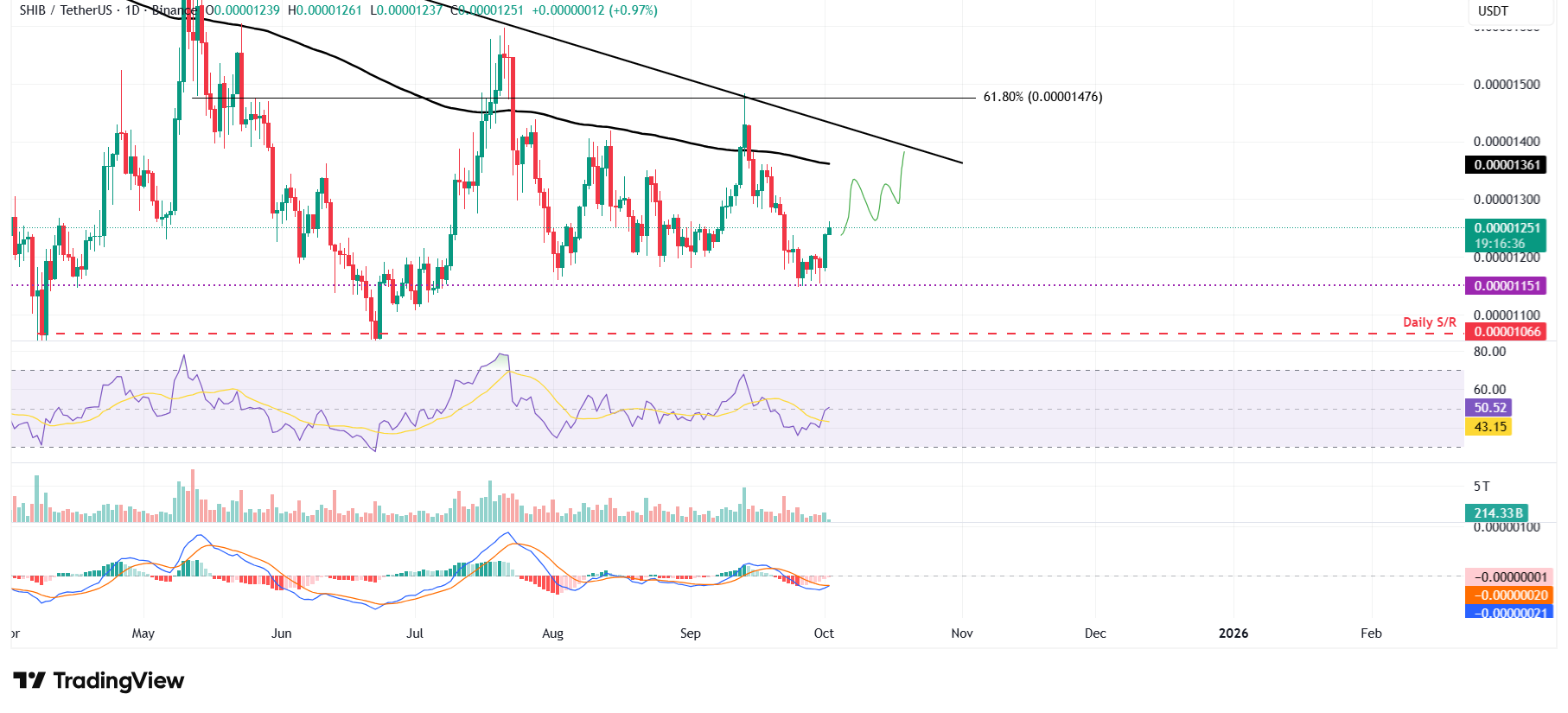 El precio de Shiba Inu encontró soporte alrededor del nivel diario de 0.0000115$ el martes y subió casi un 5% al día siguiente. Al momento de escribir el jueves, continúa cotizando a un nivel más alto, alrededor de 0.0000125$.