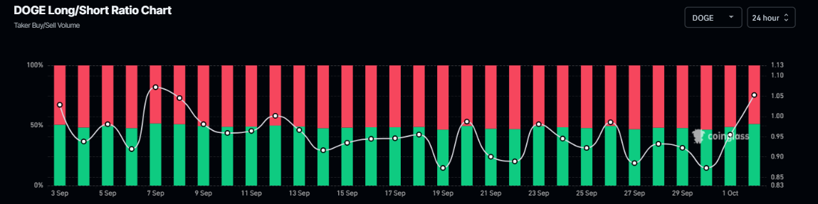 El ratio largo-corto de Coinglass de Dogecoin lee 1.05 el jueves, acercándose al nivel más alto del mes. Este ratio, por encima de uno, refleja un sentimiento alcista en los mercados, ya que más operadores están apostando a que el precio de DOGE suba.