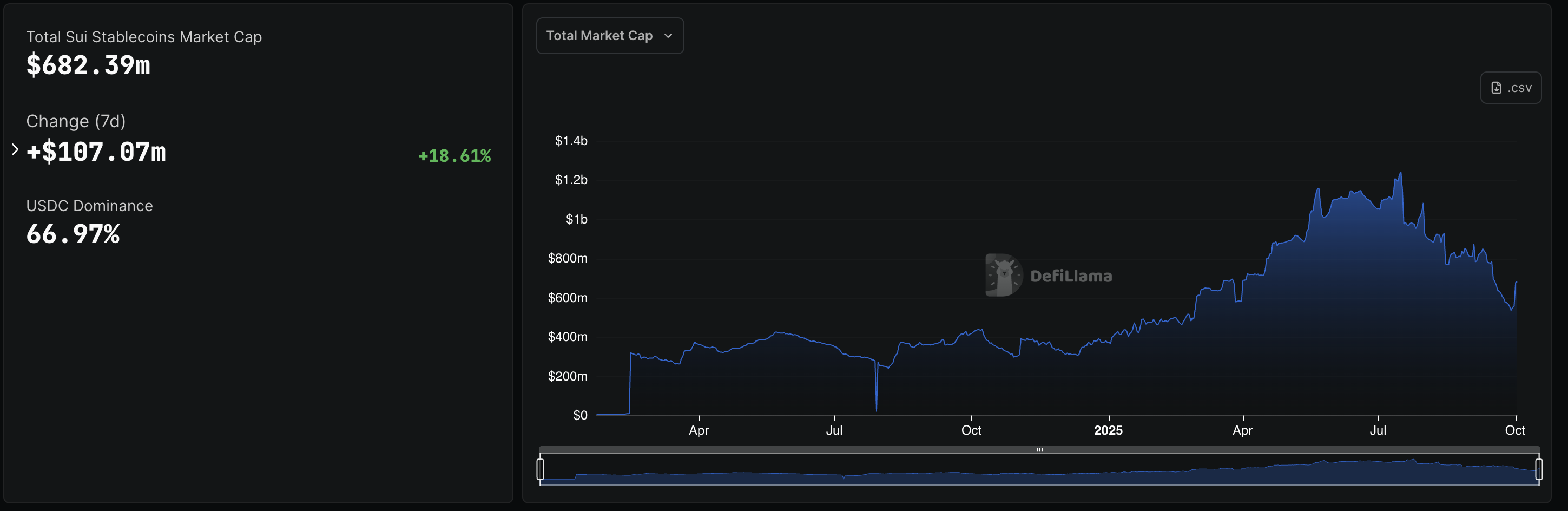 Los datos de DeFiLlama indican que la capitalización de mercado de las stablecoins en Sui ha aumentado un 18.61% en las últimas 24 horas, alcanzando los 682.39 millones de dólares, con una Dominancia de USDC, respaldada por Circle, que representa el 66.97%.