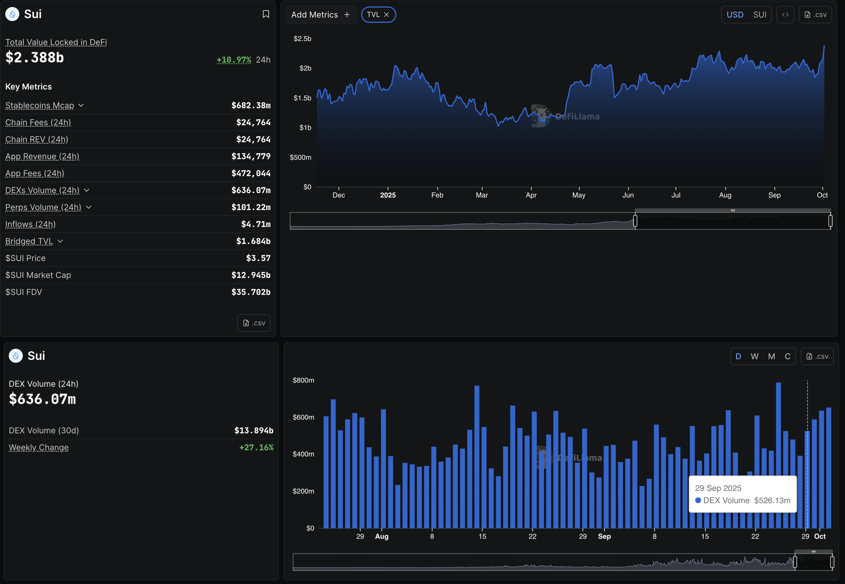 TVL y volumen de DEX de Sui. Fuente: DeFiLlama