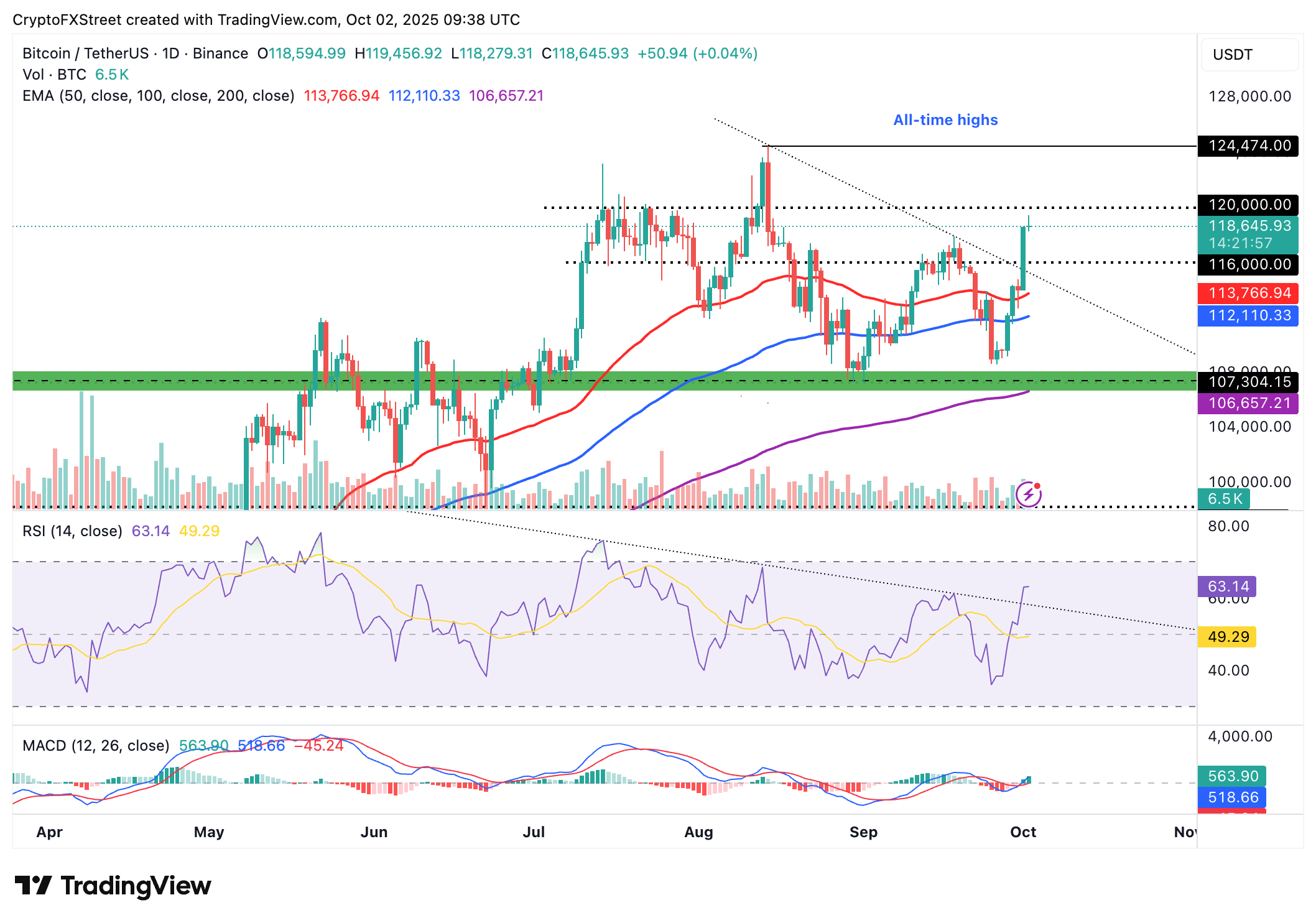 Bitcoin ha alcanzado un máximo intradía de 119.456$ hasta ahora el jueves, pero se ha retirado ligeramente, confirmando un soporte a corto plazo en 118.000$. Los indicadores técnicos clave se han alineado para respaldar la perspectiva alcista, comenzando con el Índice de Fuerza Relativa (RSI) rompiendo por encima de una línea de tendencia descendente (punteada) y situándose en 63 en el gráfico diario. Un RSI en aumento constante indica que el impulso alcista se está construyendo, lo que podría aumentar las probabilidades de que el precio de BTC cierre por encima de 120.000$ el jueves.