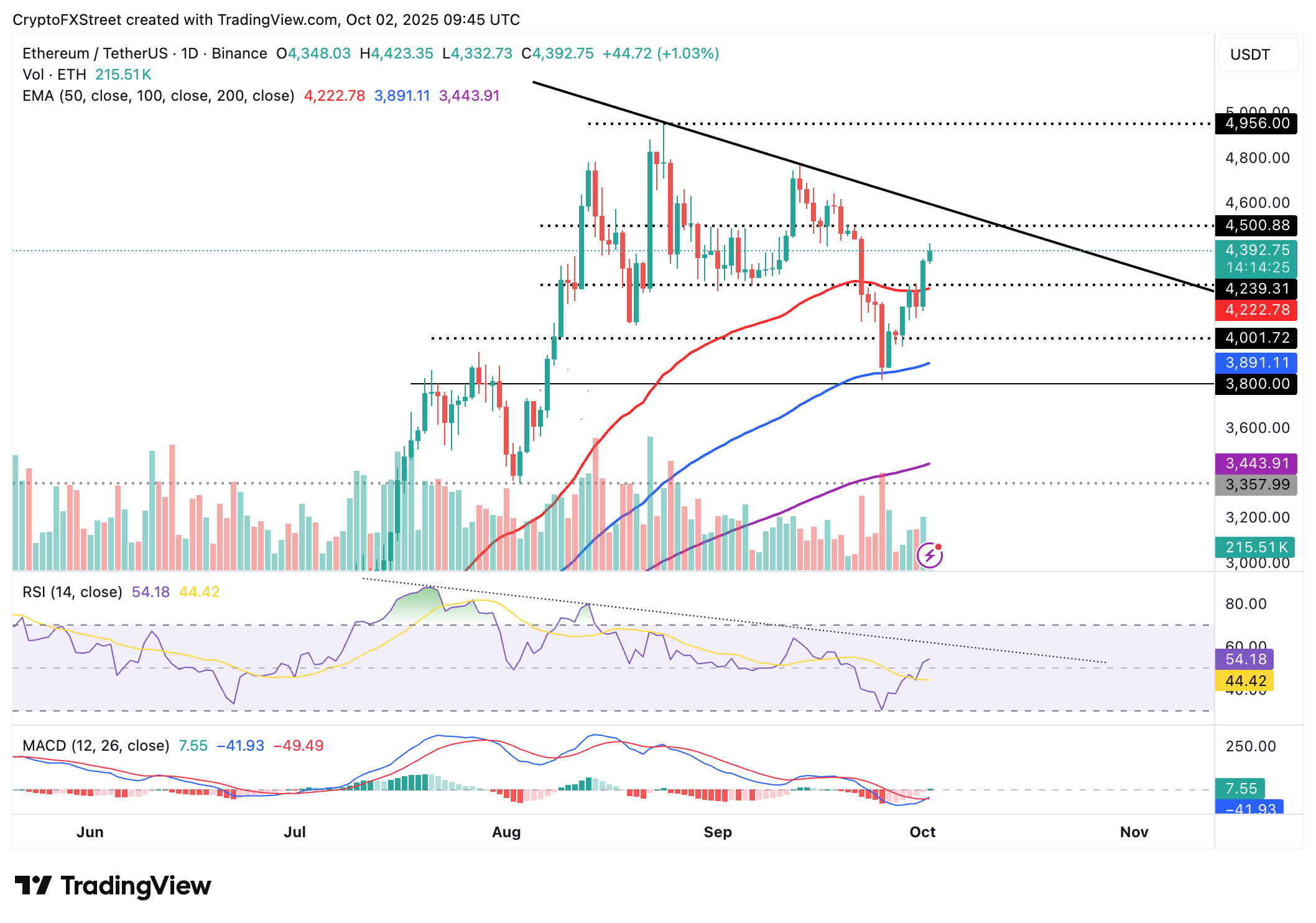 El próximo impulso podría llevar el precio de ETH cerca de su máximo histórico de 4.956$, alcanzado el 24 de agosto. Un RSI en tendencia ascendente en 54 y una señal de compra del indicador MACD en el gráfico diario refuerzan el fuerte control alcista. Los operadores considerarán aumentar la exposición al riesgo, con la línea azul potencialmente permaneciendo por encima de la línea de señal roja. Otro hito crítico para Ethereum sería romper por encima de la línea de tendencia descendente, que ha estado en su lugar en el gráfico diario desde finales de agosto.