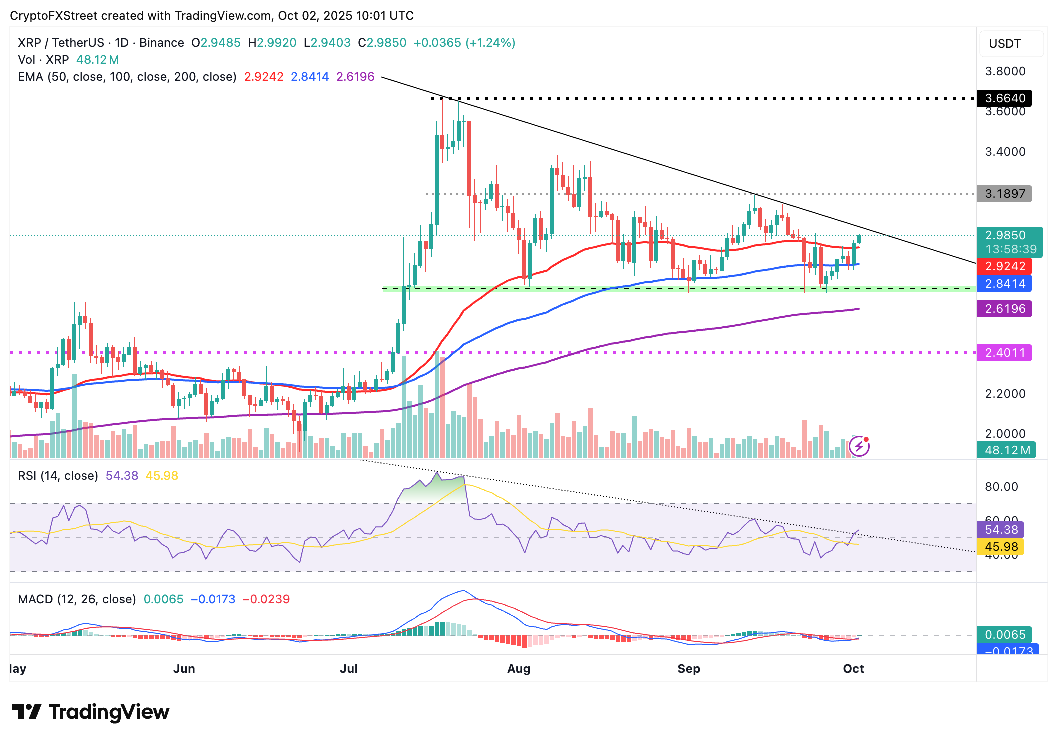 En cuanto a XRP, los alcistas están en gran medida en control, respaldados por medias móviles clave. La EMA de 50 días, posicionada en 2.92$, proporciona soporte inmediato, con la EMA de 100 días alineada en 2.84$ y la EMA de 200 días en 2.62$.