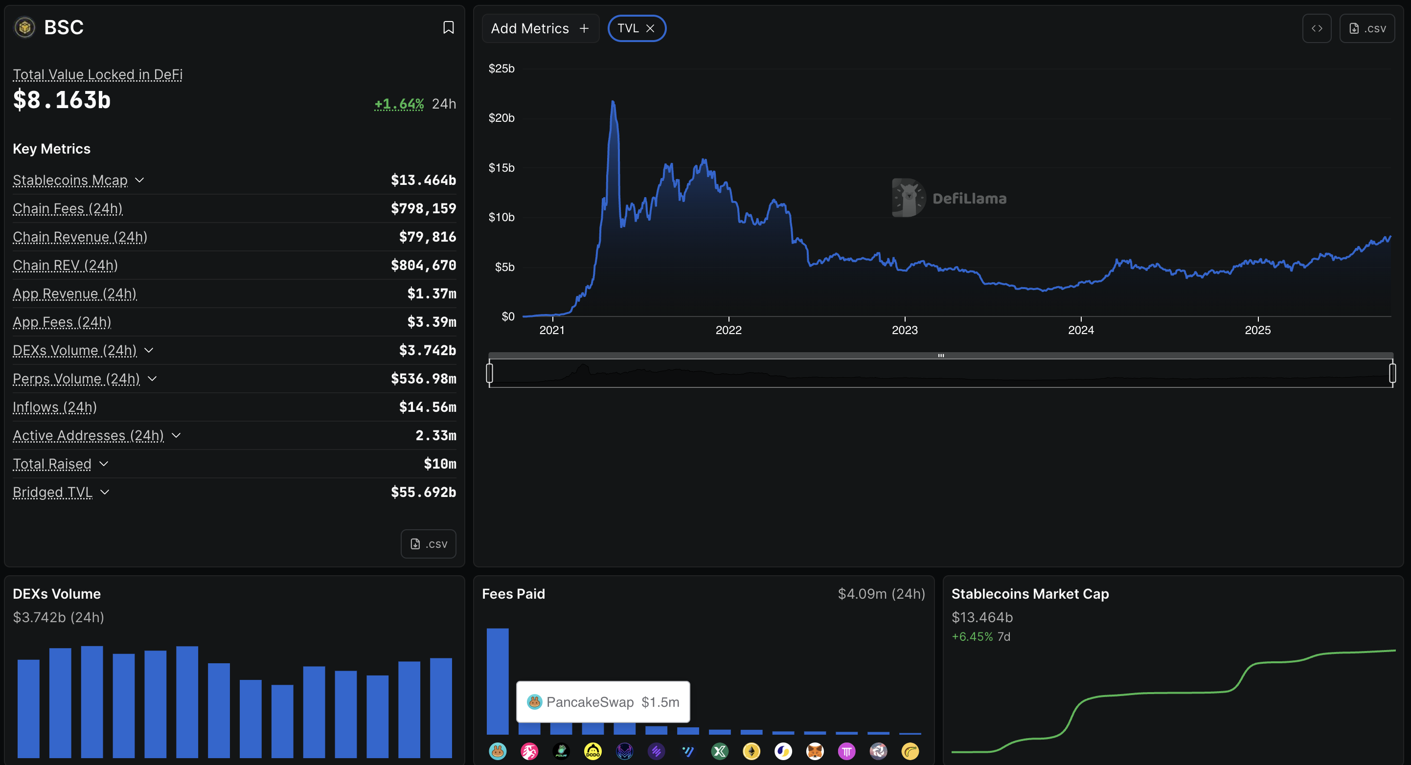 Datos DeFi de BNB Chain. Fuente: DeFiLlama
