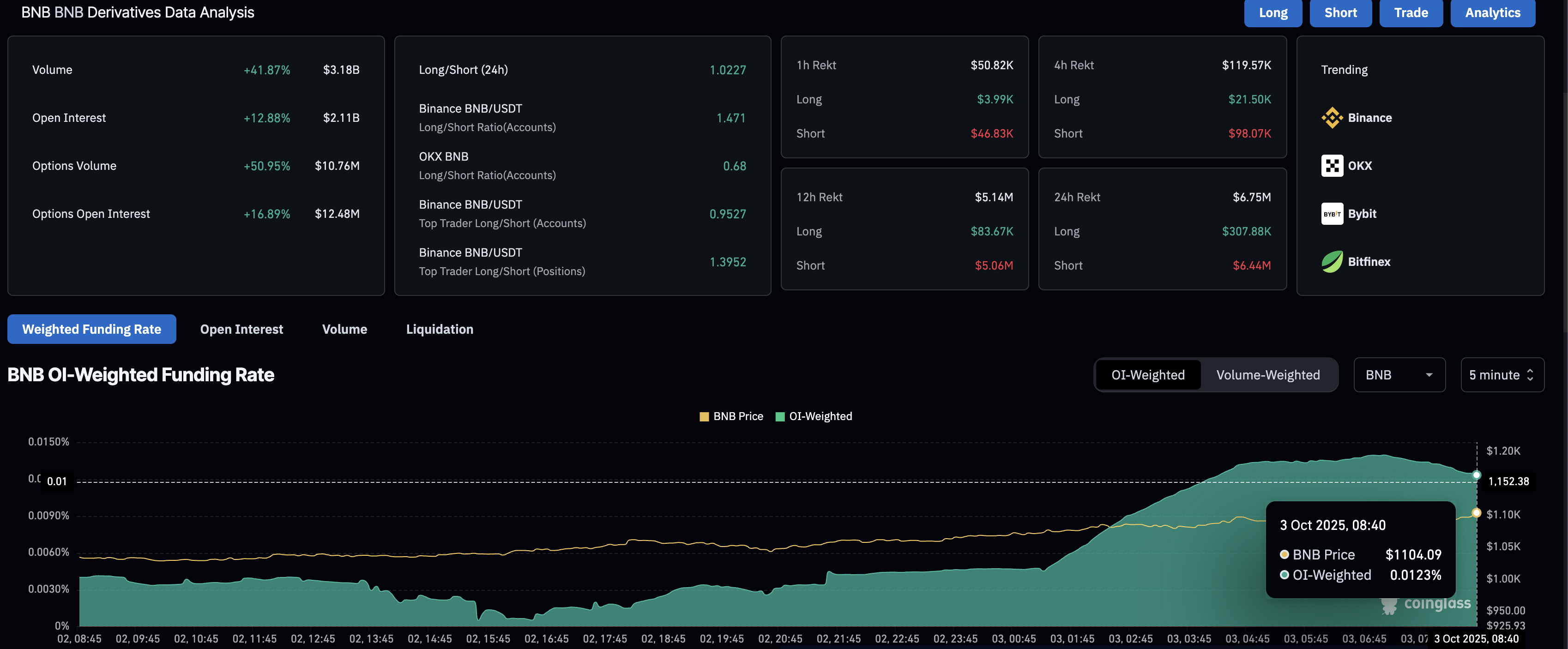 La demanda minorista del token BNB ha aumentado significativamente, alineándose con el aumento a niveles de precios récord. Los datos de CoinGlass muestran que el Interés Abierto (OI) de BNB ha aumentado un 12% en las últimas 24 horas, alcanzando los 2.11 mil millones de dólares. Un aumento en el OI se refiere a un sentimiento de riesgo entre los operadores, ya que están dispuestos a mantener o crear más posiciones largas.