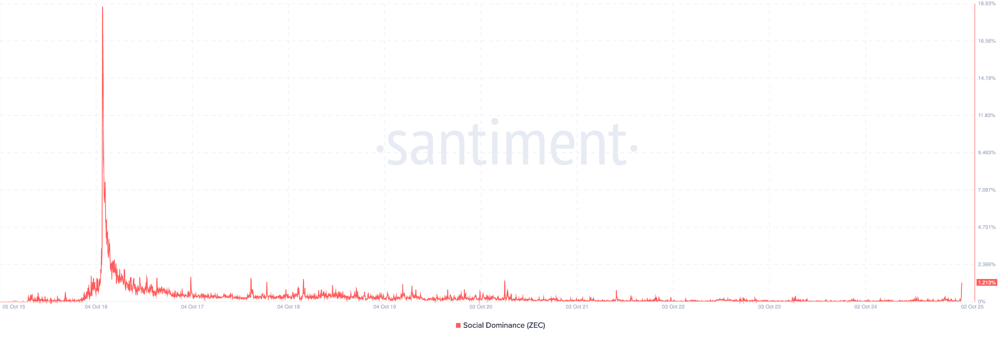 Una de las señales más claras de precaución proviene de la dominancia social de ZEC. Según Santiment, esta métrica ha subido a un máximo de cinco años de 1.21%. La dominancia social mide cuánto de la conversación cripto total se centra en un solo activo. Cuando se dispara durante los rallies, suele señalar sobrevaloración y sentimiento impulsado por la multitud.