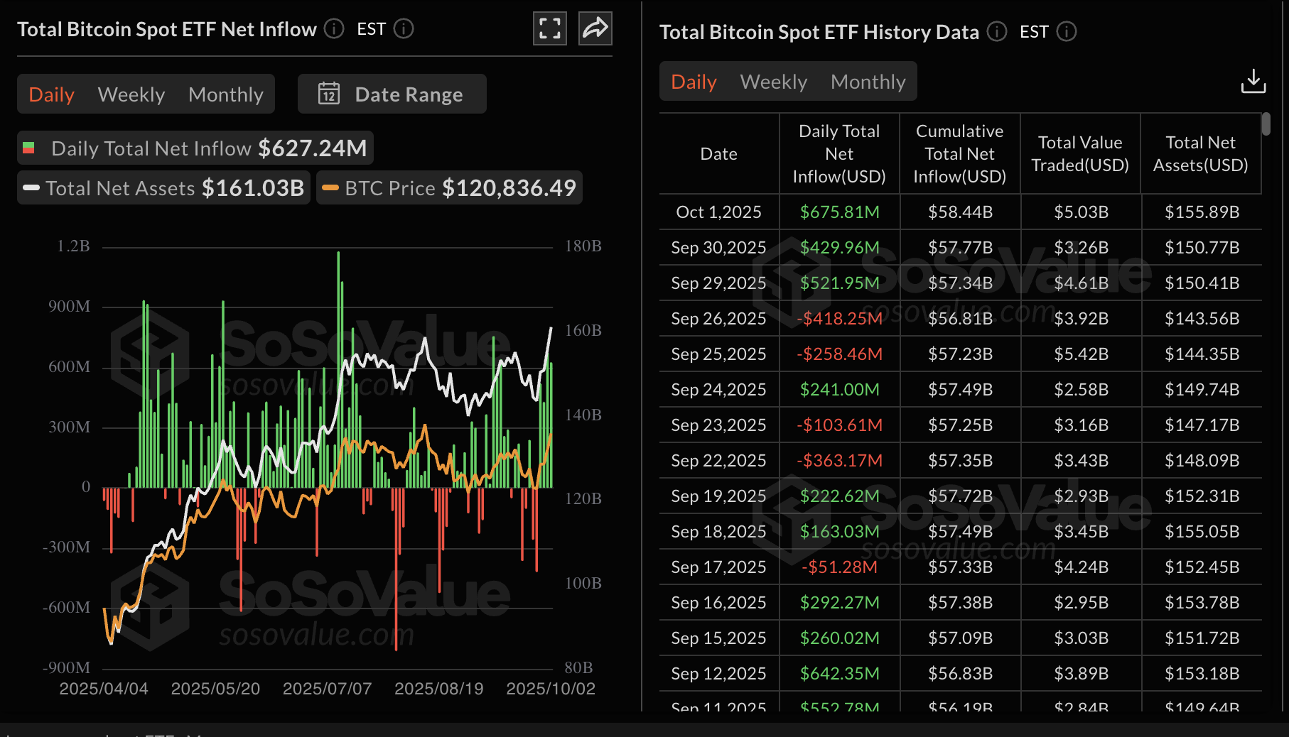 El interés en los Productos de Intercambio de Bitcoin al contado (ETF) ha mejorado significativamente desde principios de semana, reflejado por entradas constantes. Los datos de SoSoValue muestran que los ETFs estadounidenses experimentaron un total de 627 millones de dólares en entradas el jueves, 676 millones de dólares el miércoles, 430 millones de dólares el martes y 522 millones de dólares el lunes.