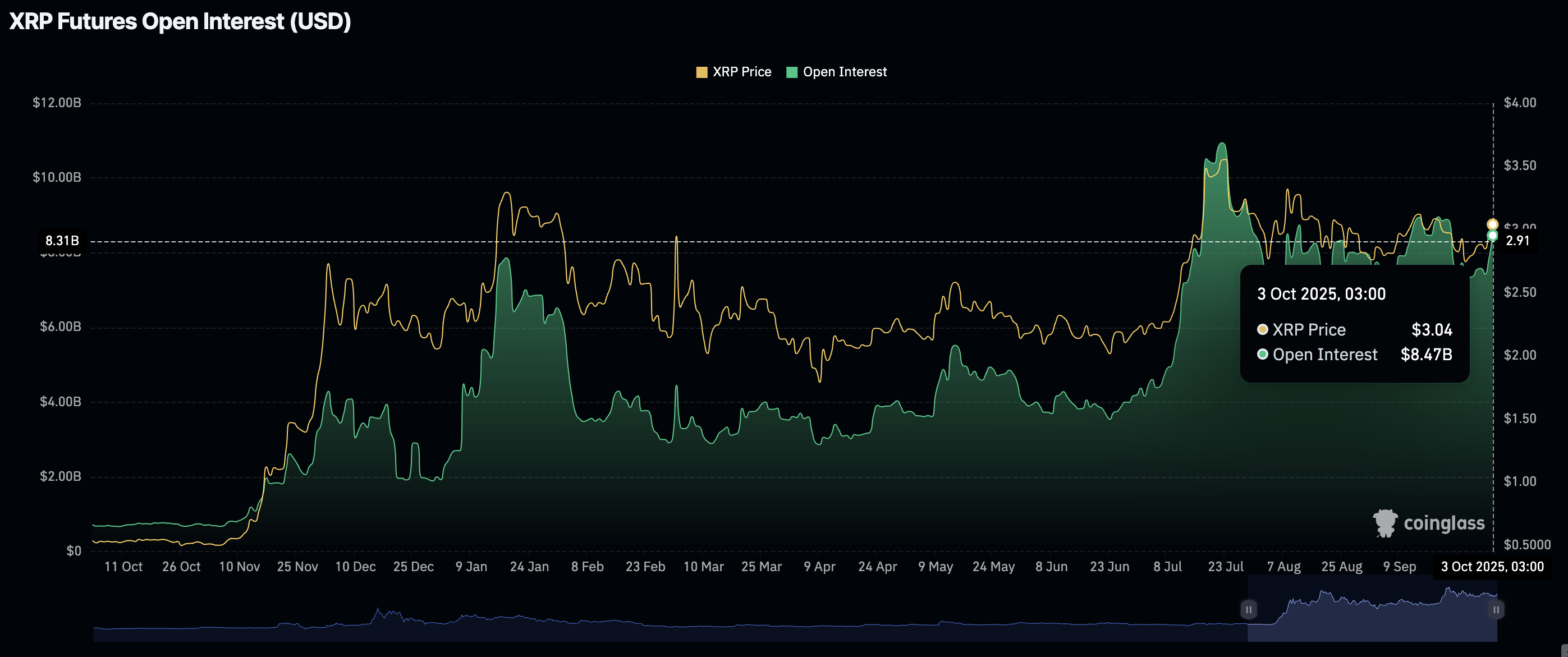 Mientras tanto, el interés minorista en los derivados de XRP está creciendo, con el Interés Abierto (OI) de futuros alcanzando un mínimo mensual de 7.35 mil millones de dólares y promediando aproximadamente 8.47 mil millones de dólares en el momento de escribir, según datos de CoinGlass. Un OI constante también implica un mayor compromiso y convicción en la capacidad de XRP para mantener la tendencia alcista a corto plazo.