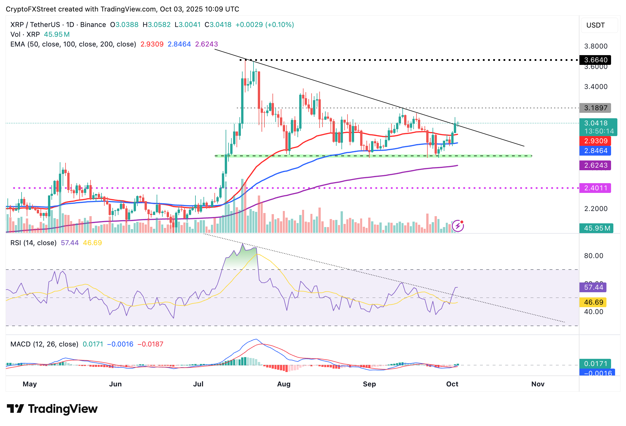 En cuanto a XRP, los alcistas están en gran medida en control, apoyados por una línea de tendencia descendente en el gráfico diario y medias móviles clave. La EMA de 50 días, posicionada en 2.93$, proporciona soporte inmediato, con la EMA de 100 días alineada en 2.84$ y la EMA de 200 días en 2.62$.