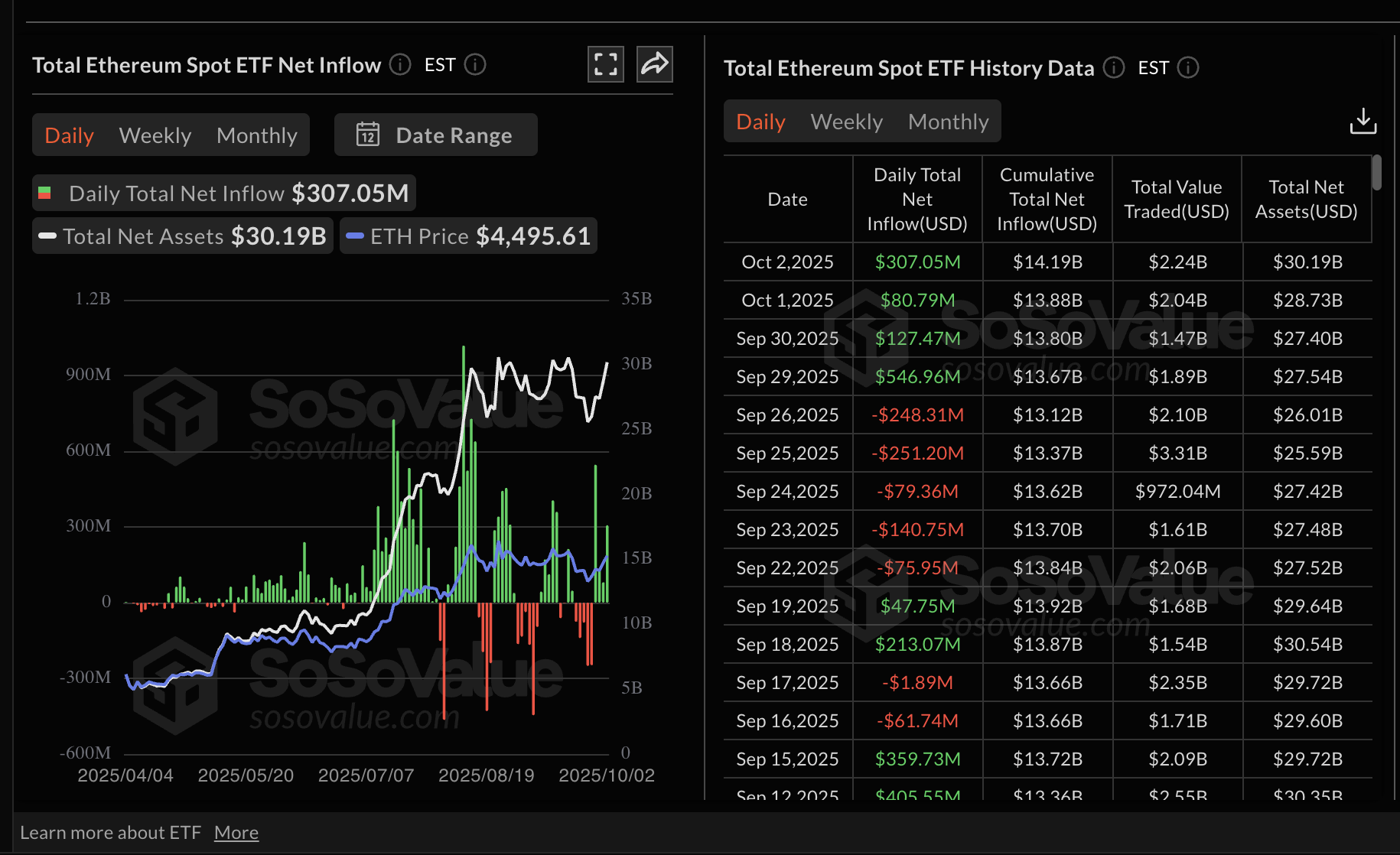 La demanda de ETFs de Ethereum al contado también ha aumentado de manera constante esta semana, pero está significativamente rezagada en comparación con la de Bitcoin. Las entradas del jueves totalizaron 307 millones de dólares, marcando cuatro días consecutivos de entradas.