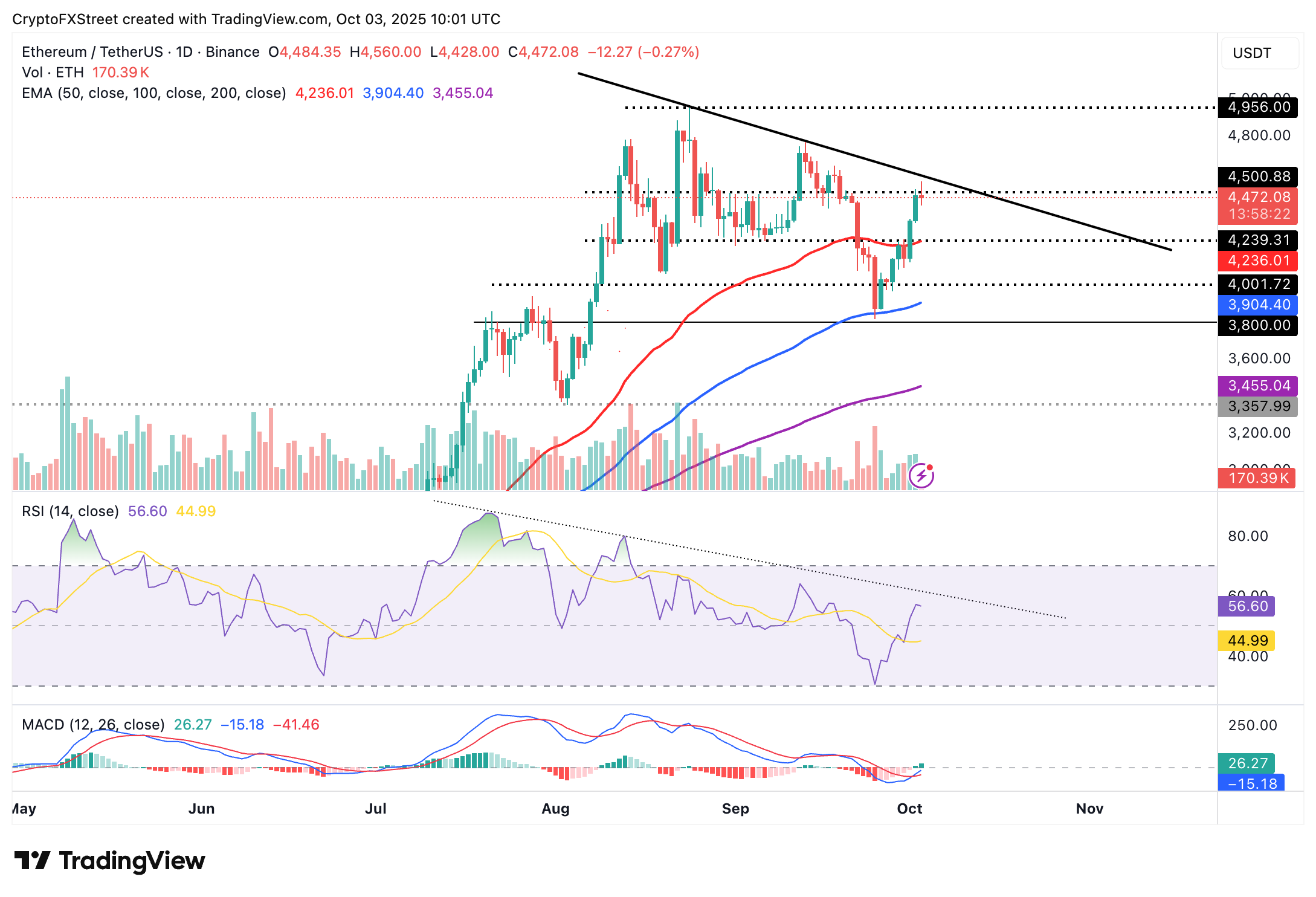 Ethereum se cotiza relativamente por encima de la EMA de 50 días, un nivel de soporte clave en 4.236$, tras un rechazo de la resistencia a corto plazo alrededor de 4.500$, lo que refuerza el sentimiento positivo del mercado.