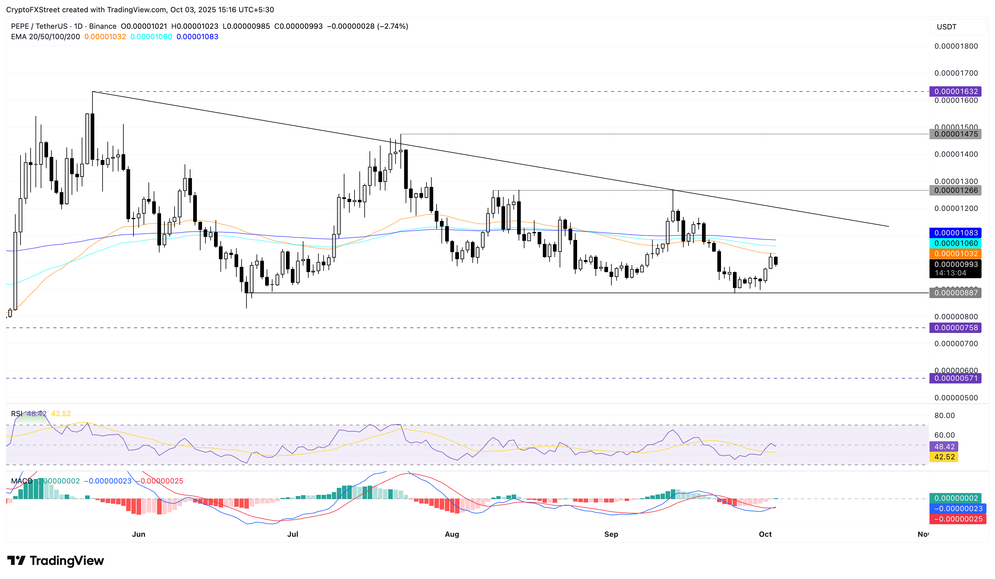 Si PEPE supera la EMA de 50 días en 0.00001032$, podría probar la EMA de 200 días en 0.00001083$, seguida de la línea de resistencia superior en 0.00001200$, que se forma al conectar los picos del 23 de mayo y del 13 de septiembre.