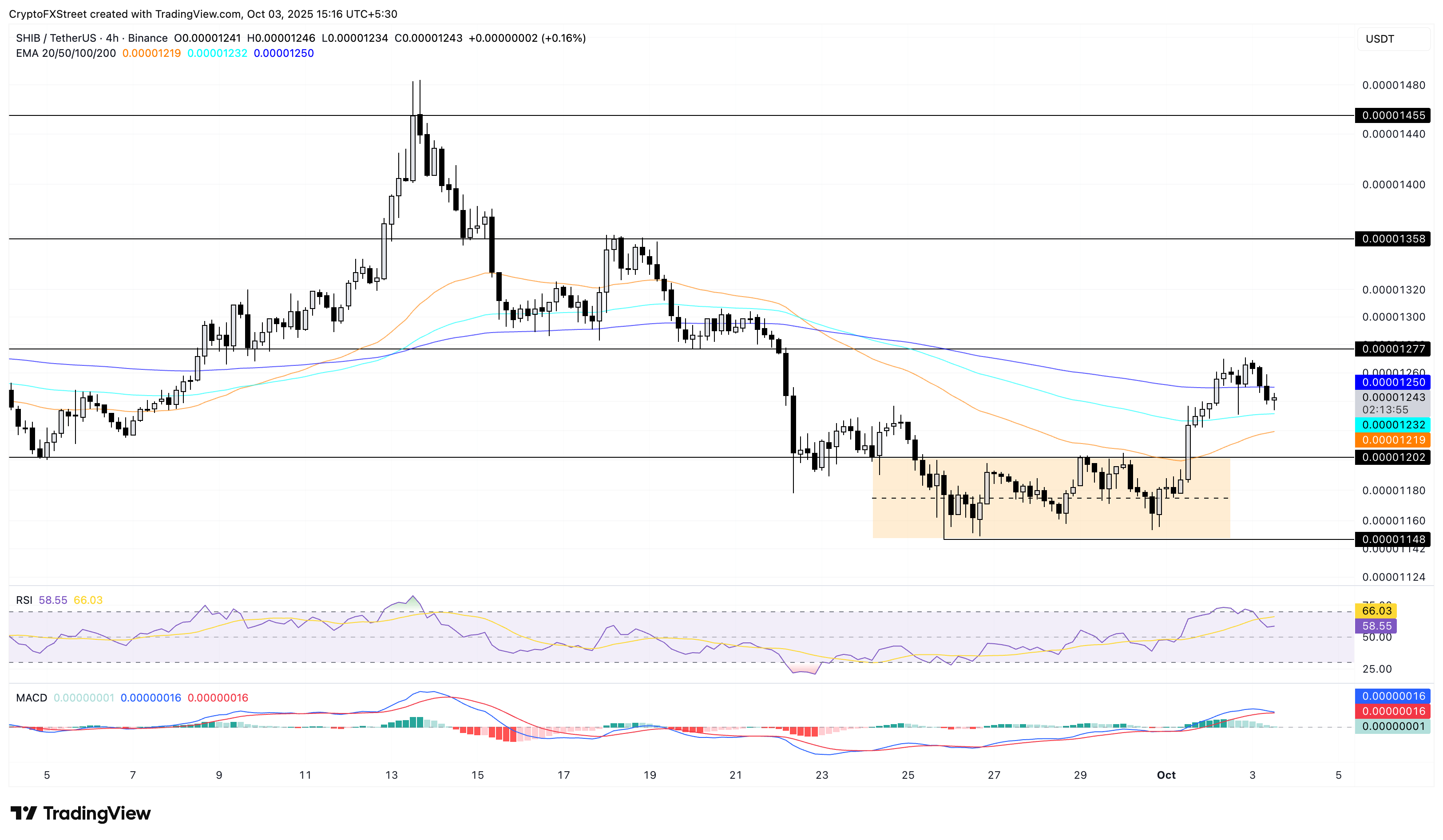 Shiba Inu adopta una ligera reversión bajista antes de alcanzar el nivel de resistencia de 0.00001277$, que anteriormente actuó como soporte el 20 de septiembre. En el momento de escribir, Shiba Inu se mantiene por encima de la EMA de 100 períodos en el gráfico de 4 horas, mientras que las EMAs de 50 y 200 períodos mantienen una alineación bajista.