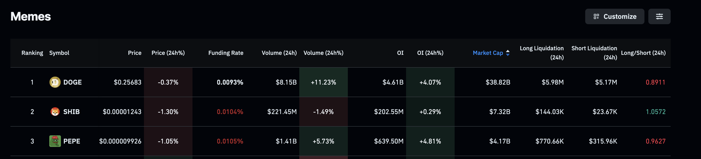 Datos de derivados de monedas meme. Fuente: CoinGlass