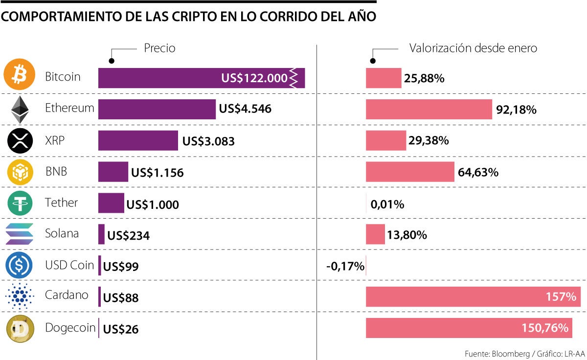 Entre las cuatro criptomonedas más valorizadas del año se encuentran: Cardano con 157%, Dogecoin con 150% de valorización, Ethereum con 92,18% y BNB con 64,63%, por otro lado, hay otras cripto que siguen creciendo de manera más moderada como XRP con 29,38%, y Bitcoin con 25,88%.