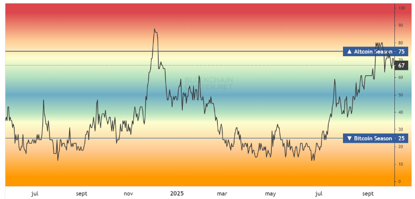 Al momento de la publicación de esta nota, el indicador marca 67 puntos. Es decir, el 67% de las criptomonedas más relevantes muestra un rendimiento superior al de BTC.