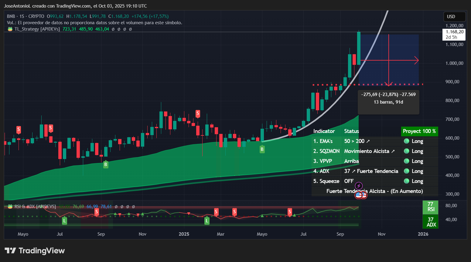 Pero aquí es donde las cosas se ponen interesantes: BNB ha estado siguiendo una poderosa línea de soporte parabólico desde mediados de año. El gráfico muestra un avance parabólico claro, el tipo que puede ofrecer ganancias explosivas pero que también tiende a terminar con correcciones igualmente explosivas. Mirando la proyección, si esta trayectoria continúa sin interrupciones, BNB podría estar cotizando cerca de $2.000 para el 31 de diciembre, potencialmente ofreciendo otra ganancia del 67% desde los niveles actuales durante los próximos 89 días.