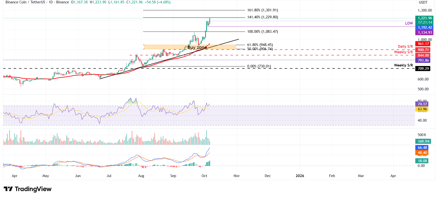 BNB rebotó tras probar un soporte clave alrededor del nivel de retroceso de Fibonacci del 61.8%, dibujado desde el mínimo del 3 de agosto de 730.01$ hasta el máximo del 21 de septiembre de 1.083.47$, en 948.45$ el 26 de septiembre y repuntó más del 24% en los siguientes 6 días, estableciendo un nuevo máximo de 1.192$ el viernes. BNB disminuyó ligeramente durante el fin de semana. En el momento de escribir el lunes, BNB extiende sus ganancias, estableciendo un nuevo máximo histórico por encima de 1.200$.