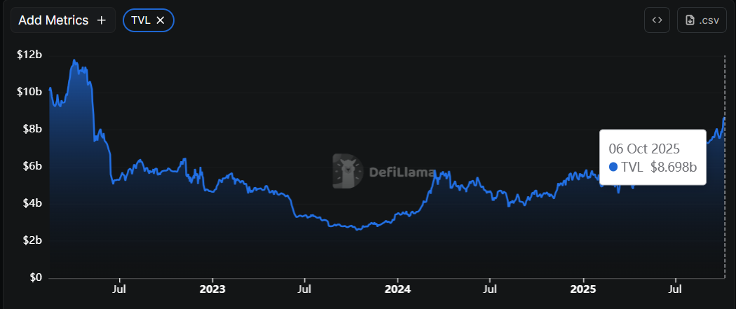 Aparte del crecimiento de las direcciones activas, el Valor Total Bloqueado (TVL) de BNB también aumenta de 7.58 mil millones de dólares el 27 de septiembre a 8.69 mil millones de dólares el lunes, el nivel más alto desde mayo de 2022. El aumento del TVL indica una creciente actividad e interés dentro del ecosistema de BNB, sugiriendo que más usuarios están depositando o utilizando activos dentro de los protocolos basados en BNB.