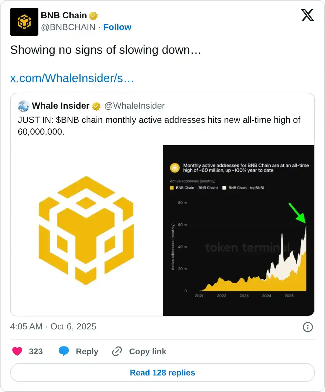 Las direcciones activas mensuales de BNB alcanzan 60 millones, duplicándose en lo que va del año