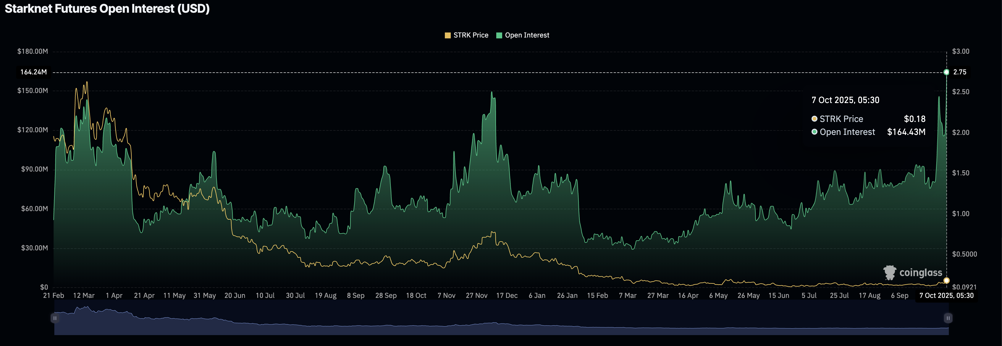 La demanda minorista por Starknet sigue creciendo, como lo demuestra los datos de CoinGlass que muestran que el Interés Abierto (OI) de Futuros STRK ha alcanzado un récord de 164.43 millones de dólares, subiendo desde 117.63 millones de dólares el lunes. Generalmente, un aumento en el OI de Futuros se asocia con un aumento en el sentimiento de riesgo positivo entre los operadores de derivados que acumulan posiciones largas más grandes, anticipando ganancias adicionales.