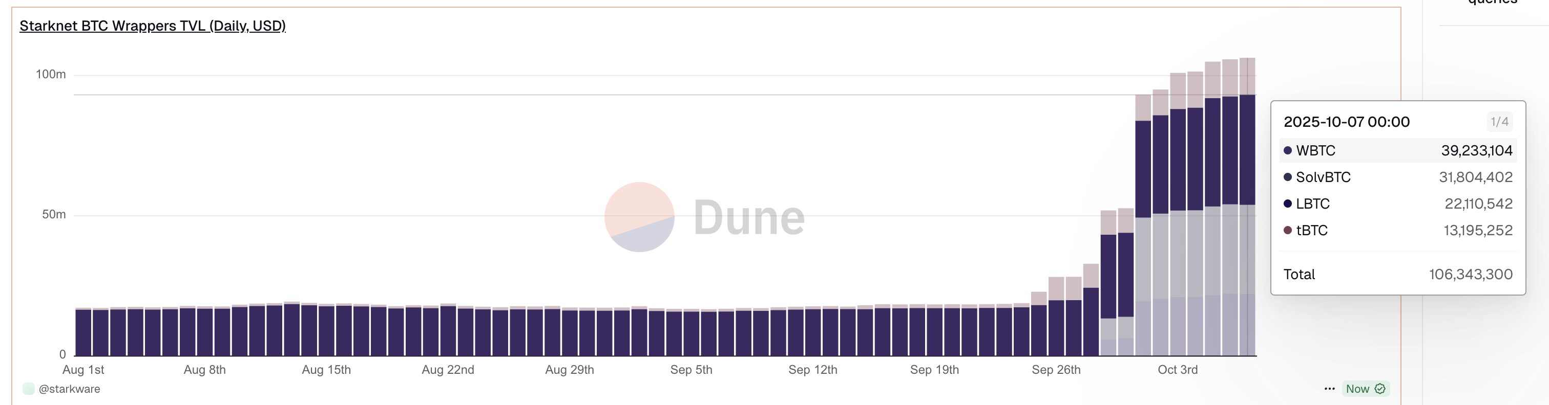 Bitcoin envuelto apostado en la mainnet de Starknet. Fuente: Dune