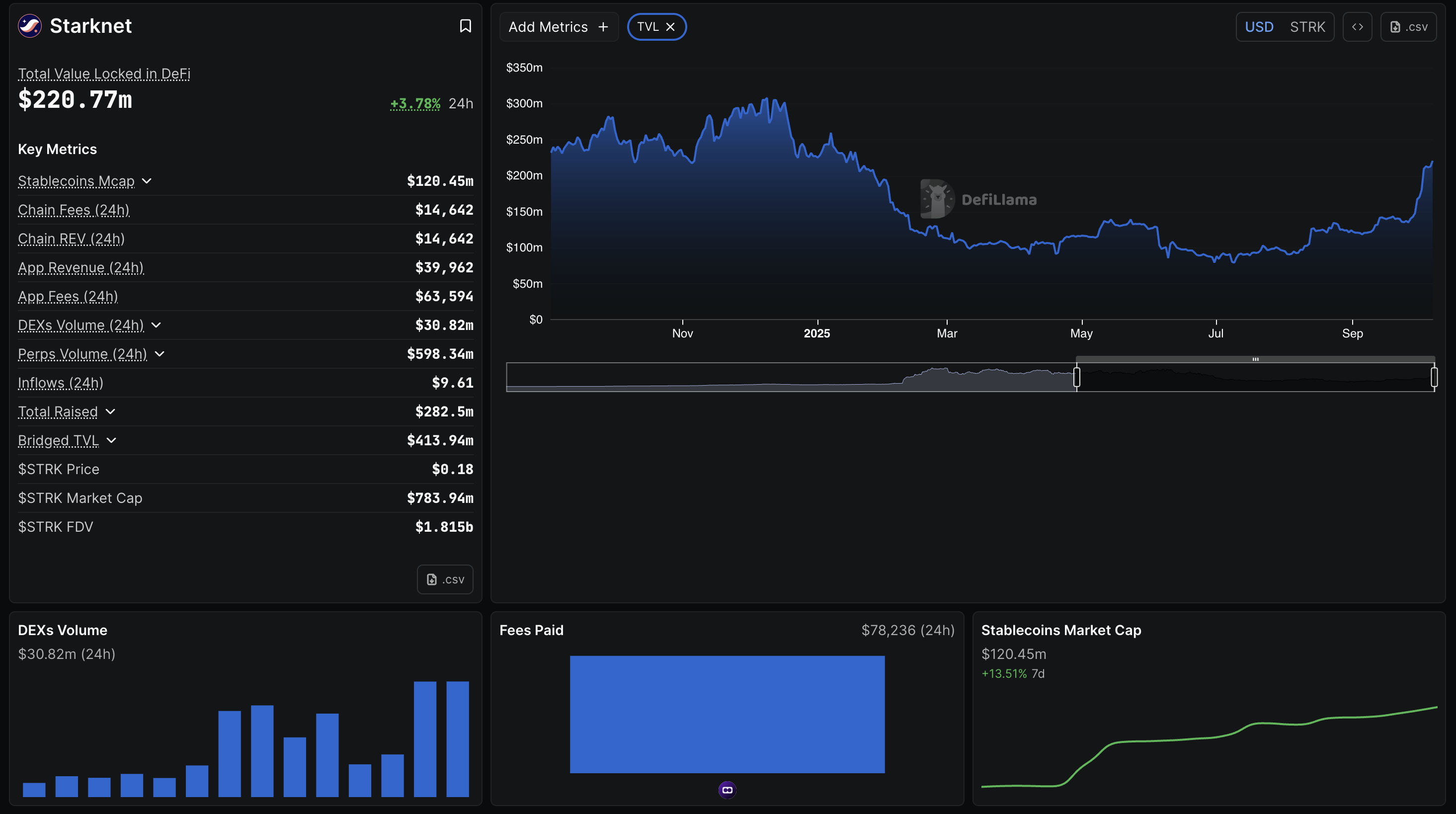 El Valor Total Bloqueado (TVL) en Starknet ha aumentado un 3.78% en las últimas 24 horas, alcanzando los 220.77 millones de dólares, indicando un aumento en los activos digitales depositados en la red. Típicamente, un aumento en el TVL se refiere a una mayor adopción de la red y confianza del usuario.