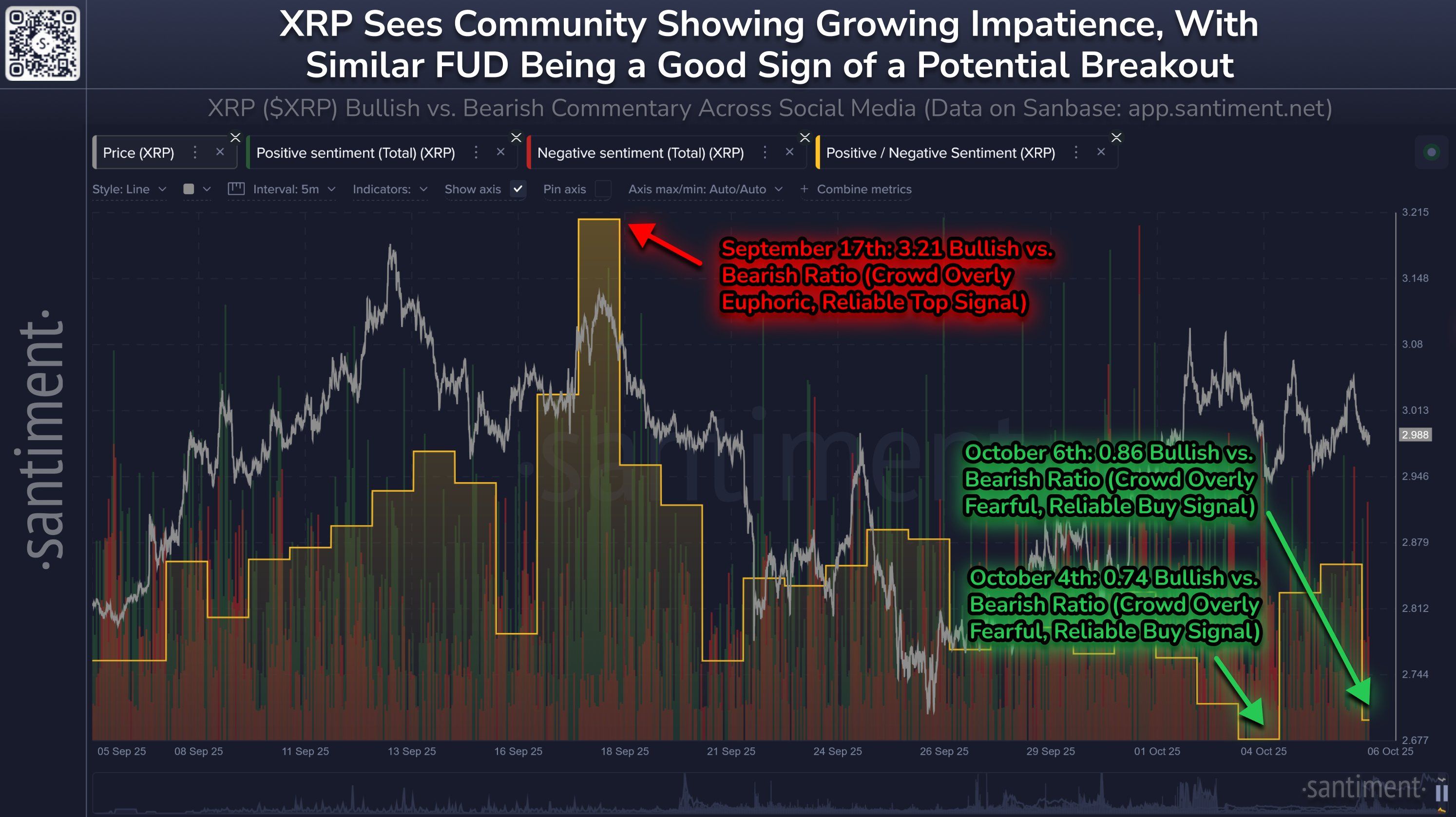 Durante la primera semana de octubre, el volumen de comentarios negativos superó al positivo por segunda vez en tres días, alcanzando el nivel más pesimista desde abril. En esa ocasión, el llamado “miedo de la multitud” precedió a un repunte del 18 % en el precio de XRP en menos de dos semanas.