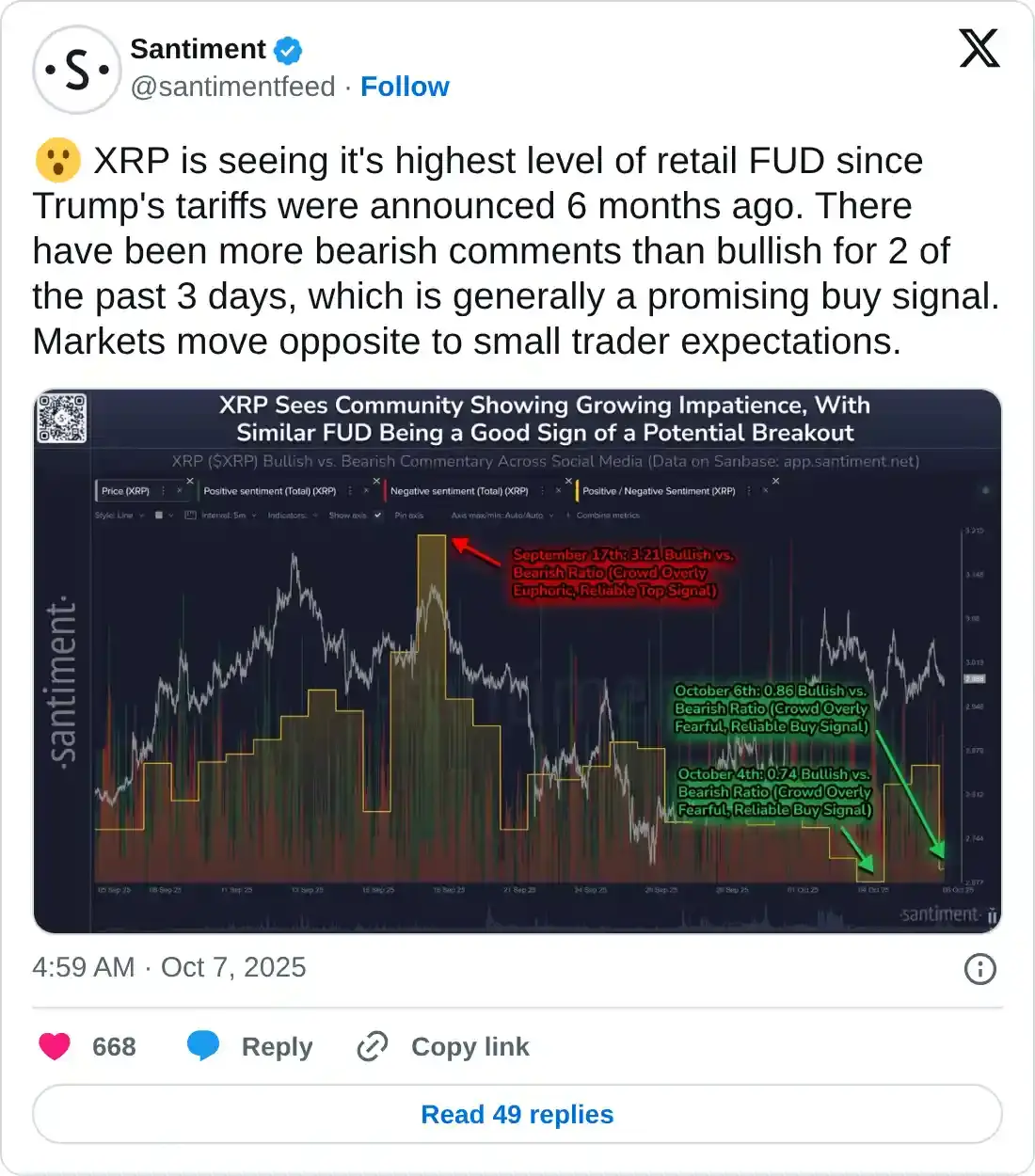 El cambio en el sentimiento señala una creciente impaciencia por un rally, con comentarios bajistas sobre XRP superando a las declaraciones alcistas en las plataformas de redes sociales.