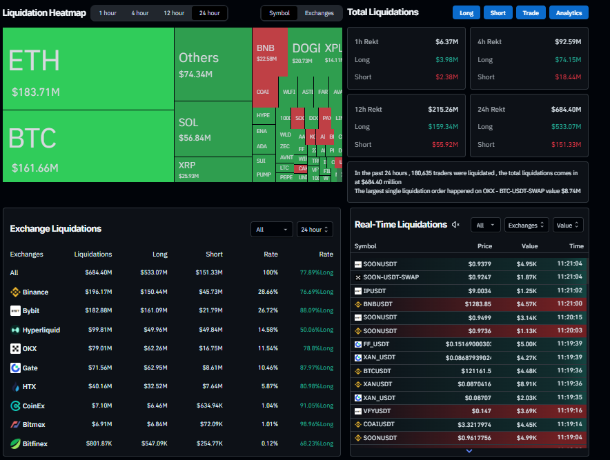 El mercado de criptomonedas sigue en rojo en el momento de escribir el miércoles, tras una caída el día anterior. La corrección de precios ha desencadenado una ola de liquidaciones por un valor de más de 680 millones de dólares en las últimas 24 horas, con el 77% de las posiciones siendo largas, destacando la sobreexposición alcista entre los traders.