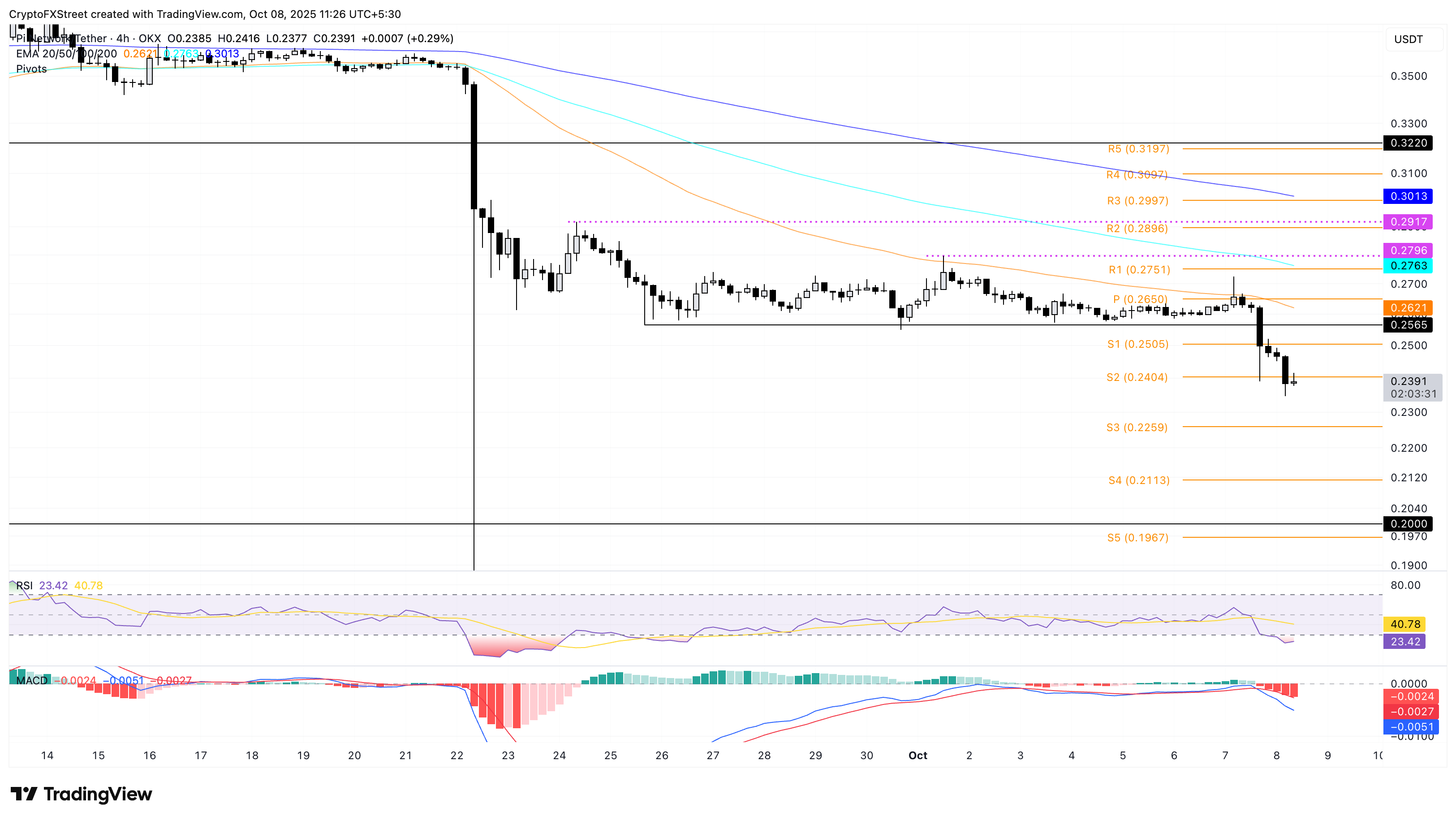 Si la tendencia a la baja en PI persiste, podría encontrar soporte en los niveles de Punto de Pivote S3 y S4, ubicados en 0.2259$ y 0.2113$, respectivamente. Mientras tanto, el mercado anticipa una posible caída al soporte psicológico de 0.2000$.