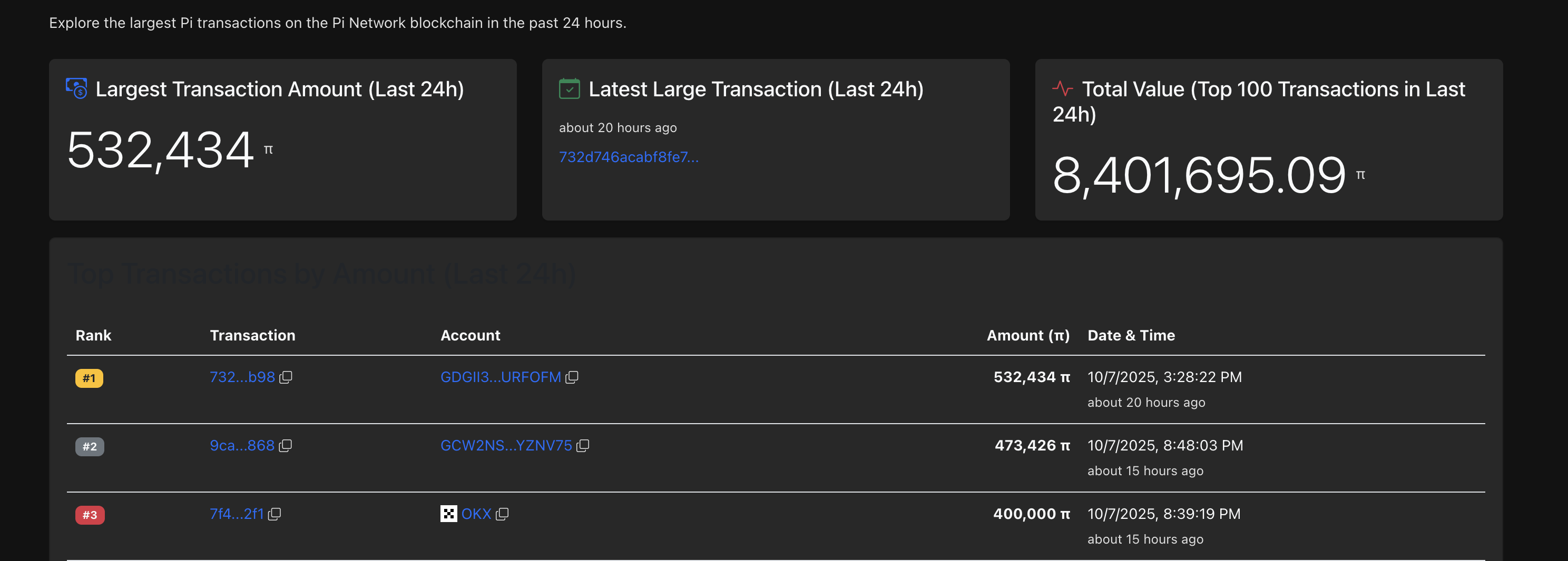 El interés minorista en Pi Network está disminuyendo gradualmente a medida que los usuarios depositan en Exchanges Centralizados (CEX) en grandes cantidades. Los datos de PiScan muestran que dos de las transacciones más grandes en la red Pi, basadas en volumen, son depósitos de usuarios de 532.434 PI y 473.426 PI tokens. Típicamente, los tokens que se trasladan de la cadena a las plataformas se consideran parte de la presión de suministro.