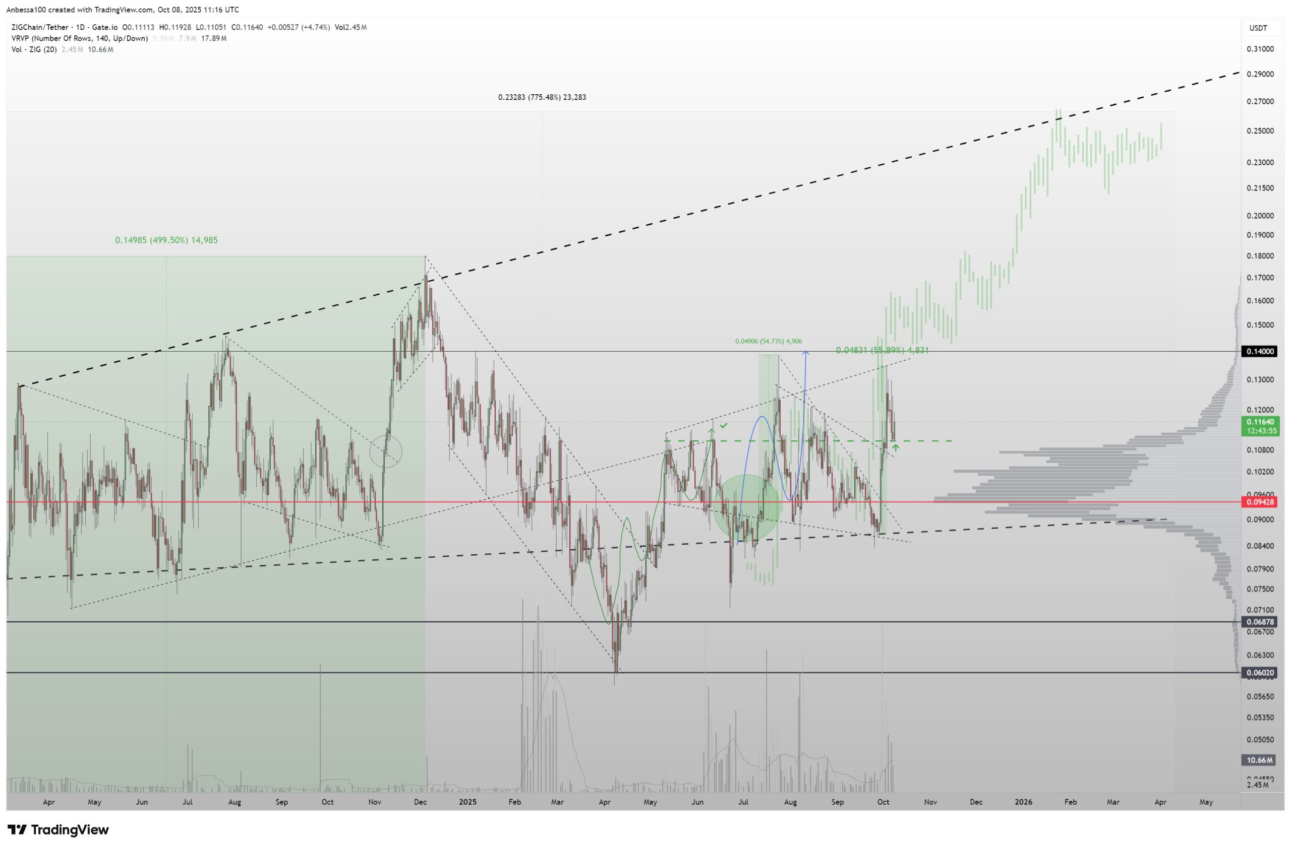 “Hice una compra a largo plazo en 2024 y he mantenido mis tokens ZIG en staking durante más de un año. Espero recibir recompensas a principios de noviembre, pero lo más importante, anticipo que el aumento continuará. Desde una perspectiva de análisis técnico, observamos la consolidación de un triángulo simétrico y un posterior s/r flip en $0.1106. No podría estar más listo para una corrida por encima de $0.14.”