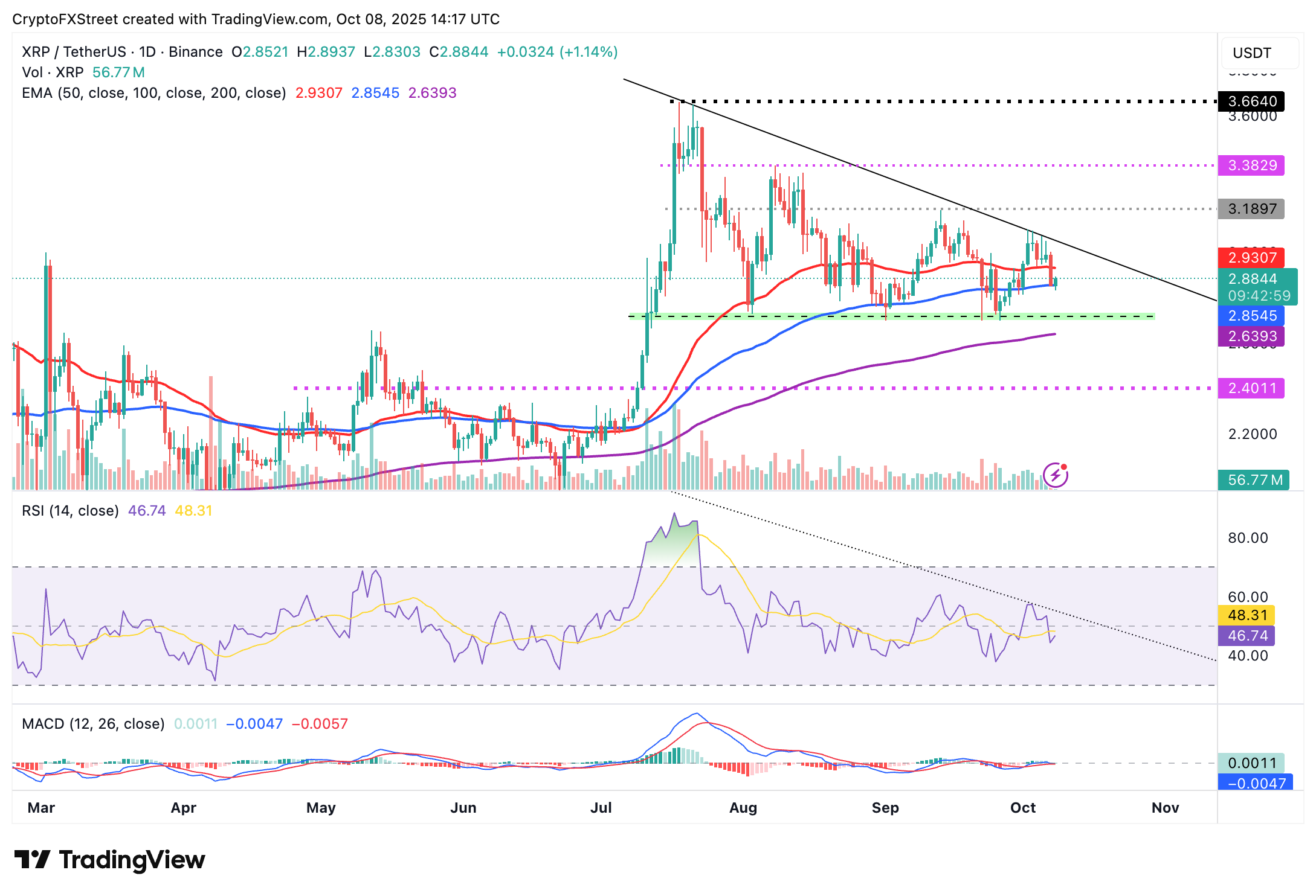 Ripple ($XRP) está luchando por mantenerse por encima de un soporte a corto plazo en 2.85$ el miércoles, reflejando un mercado de criptomonedas relativamente tranquilo tras una fuerte caída el día anterior.