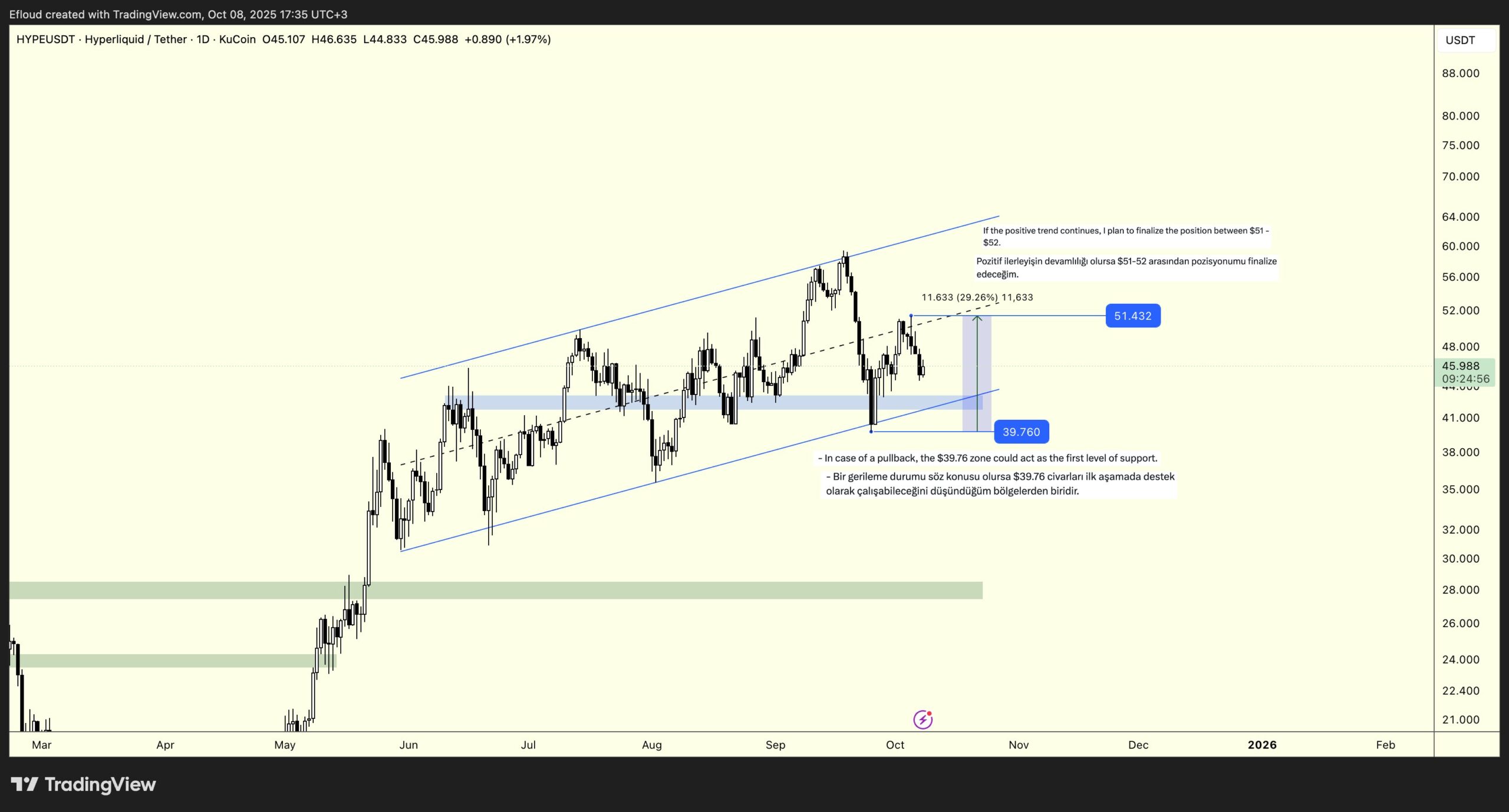 En un análisis reciente, Efloud compartió un gráfico que sugiere que el nivel de $42 podría servir como un fuerte soporte para HYPE Coin. Si se pierde esta base, podría indicar una tendencia negativa más amplia. Una posible corrección a nivel de mercado podría activar alertas en la región de $28, que Efloud ha señalado como crítica.