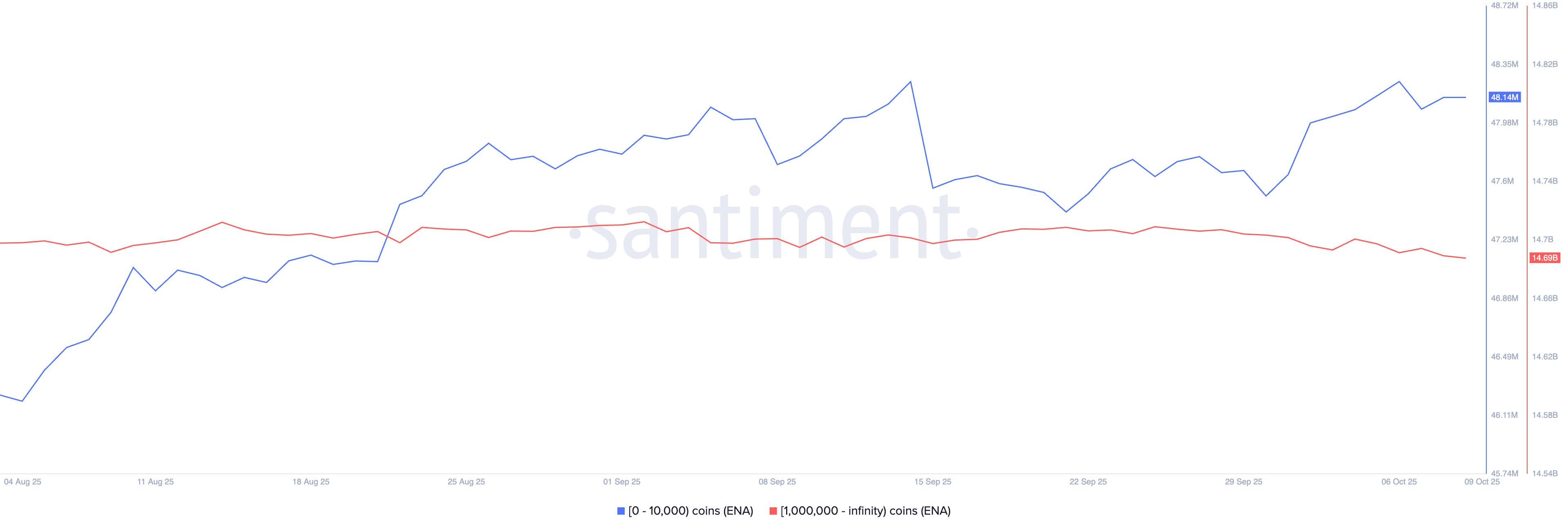 Las métricas en cadena corroboran el aumento del interés minorista, ya que los datos de Santiment revelan que los inversores con una tenencia de 0 a 10,000 tokens ENA han alcanzado un total de 48.14 millones de monedas el jueves, frente a 47.51 millones el 30 de septiembre.