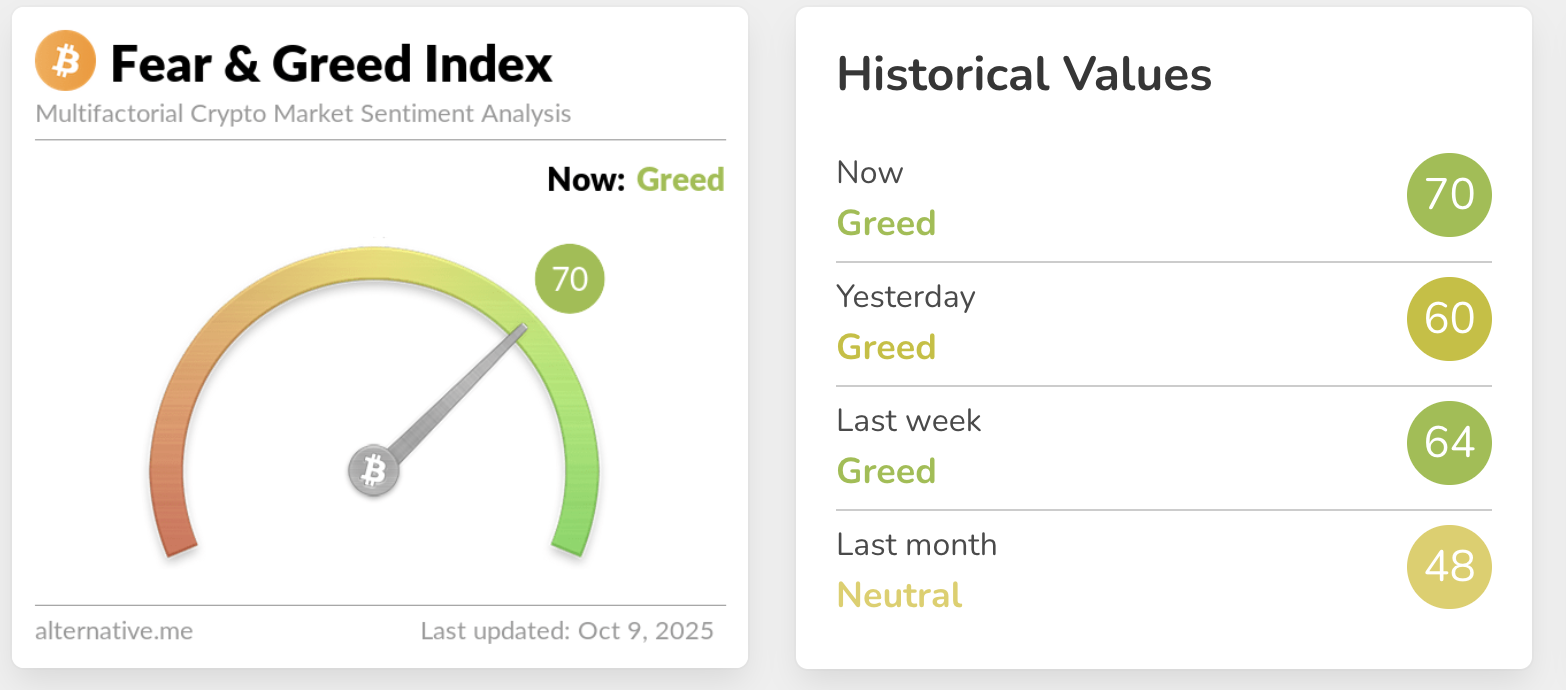 El Índice de Miedo y Codicia de Alternative.me sube a 70, indicando un sentimiento de codicia en el mercado de criptomonedas, tras el aumento del Bitcoin a un nuevo máximo histórico de 126.199$ el lunes.