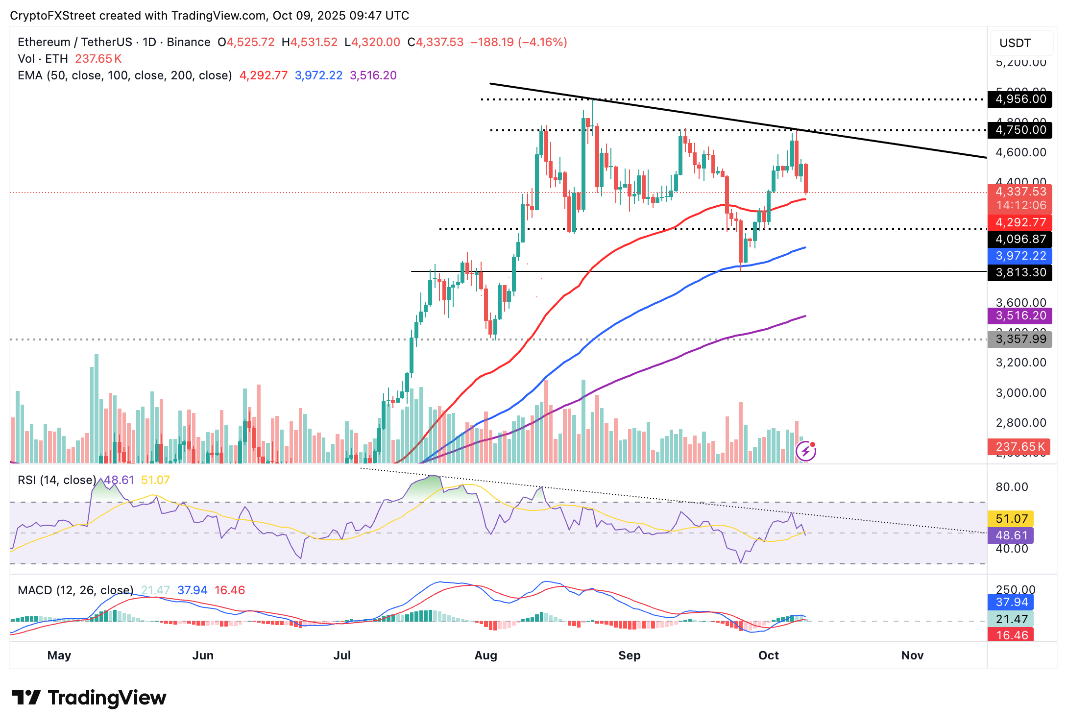 Los toros de Ethereum están mirando un posible rebote a medida que el token de contratos inteligentes se acerca al soporte de la EMA de 50 días proporcionado en 4.292$. Un RSI en tendencia a la baja en 48 refuerza el control bajista a corto plazo.