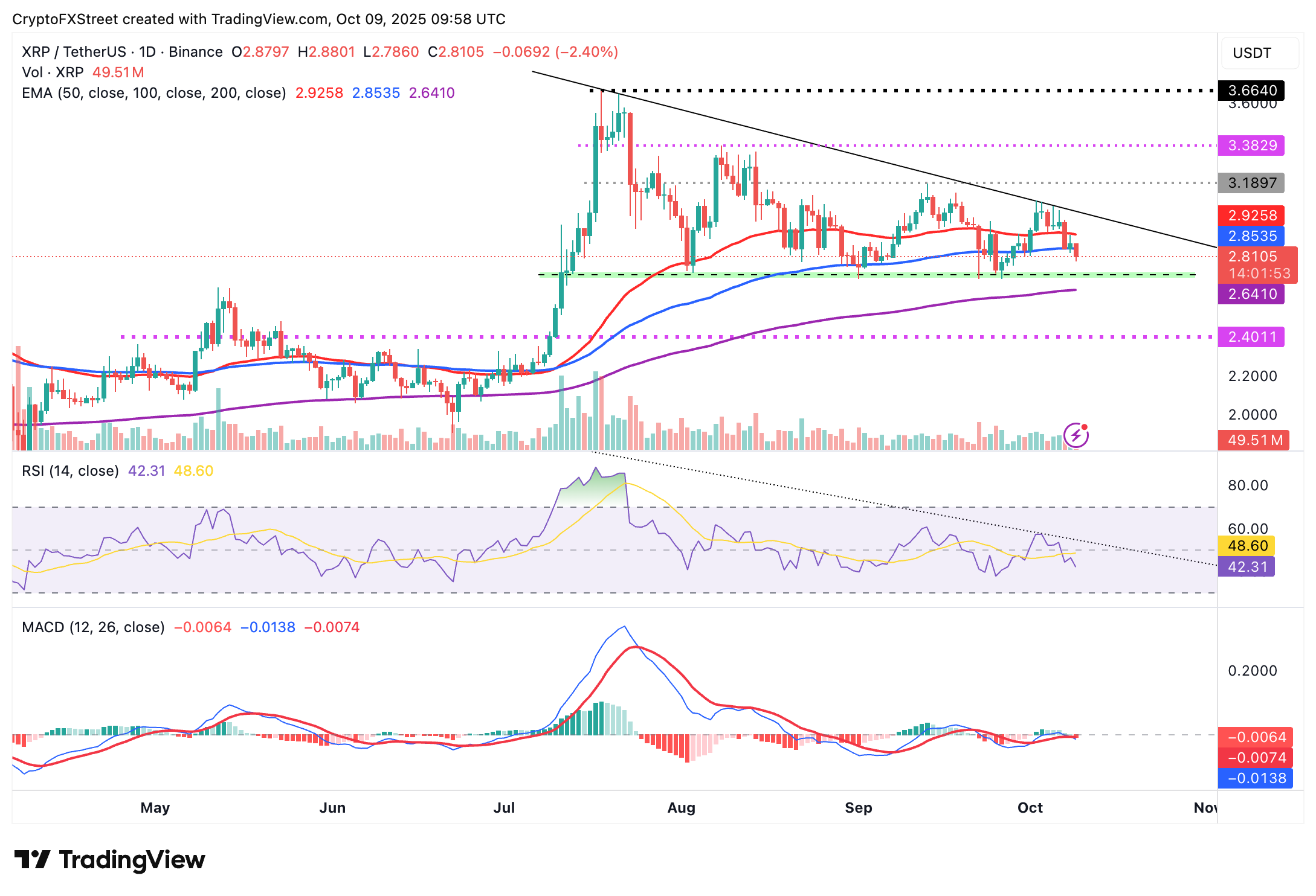 En cuanto a XRP, los bajistas parecen tener la ventaja, respaldados por el retroceso del RSI a 42 en el gráfico diario desde 57 a principios de este mes. El token de remesas de dinero transfronterizas cae por debajo de la EMA de 100 días, actualmente en 2.85$, indicando un sentimiento bajista.