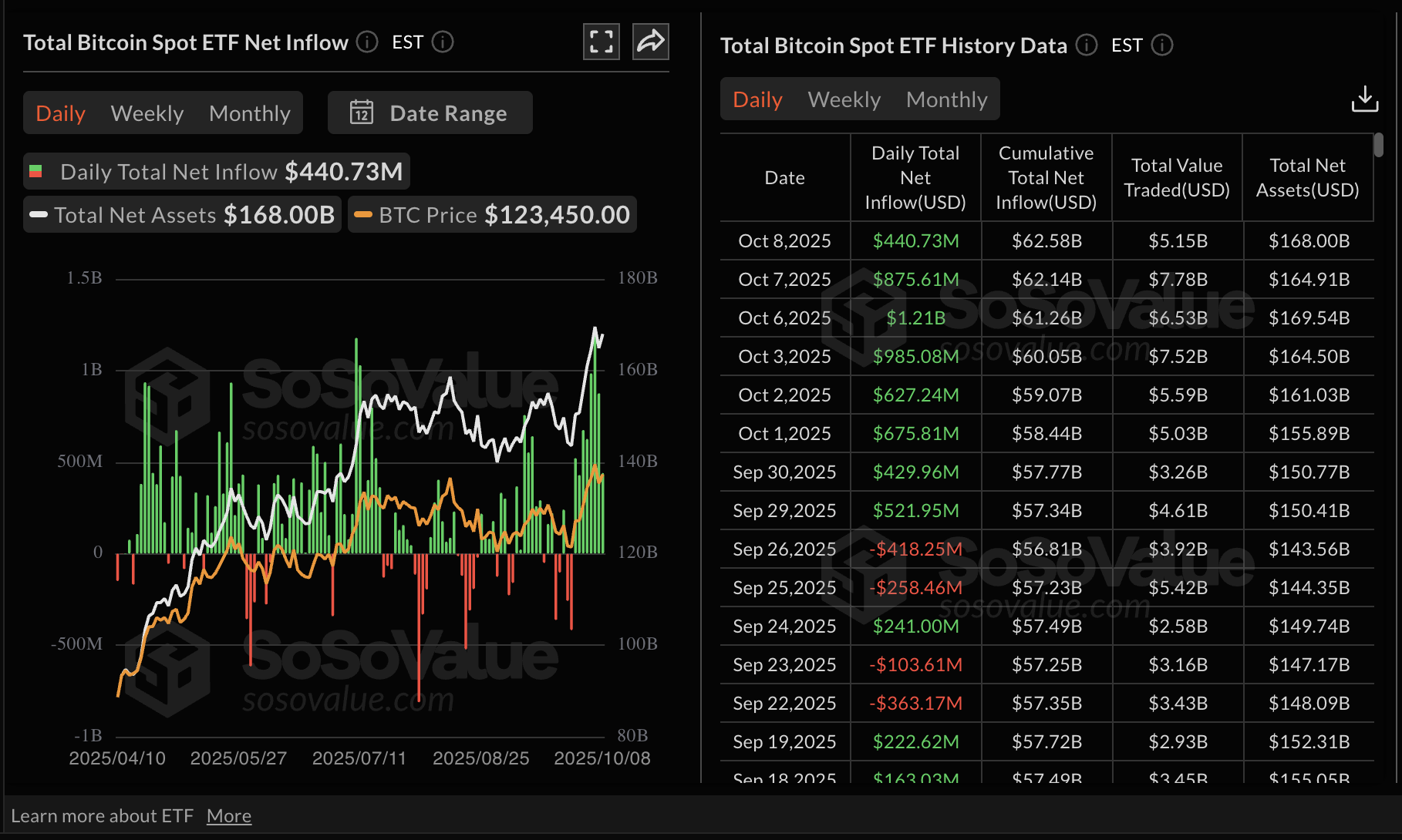 Los fondos cotizados en bolsa (ETFs) de Bitcoin al contado marcaron ocho días consecutivos de entradas el miércoles, con 441 millones de dólares, reflejando una demanda constante de inversores institucionales.
