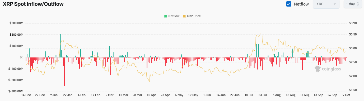 Mientras tanto, el flujo neto de XRP hacia exchanges ha sido mayoritariamente negativo en las últimas semanas, señal de que los inversores trasladan fondos a sus carteras para autocustodia. Esto respalda la tesis alcista al reducir la presión de venta inmediata.
