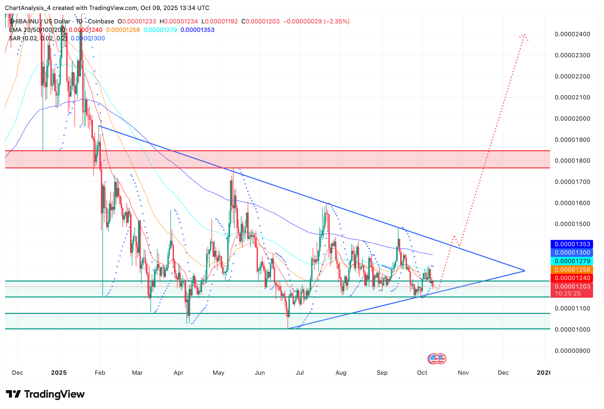 SHIB continúa comprimiéndose dentro de un triángulo simétrico que dura ya un año, con una resistencia en 0,00001350 y un soporte ascendente cerca de 0,00001200.