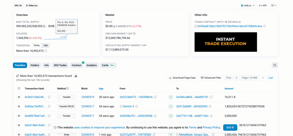 Shiba Inu mantiene más de 1,54 millones de titulares a fecha de 9 de octubre, lo que demuestra una fuerte retención de la comunidad a pesar de la volatilidad macroeconómica.