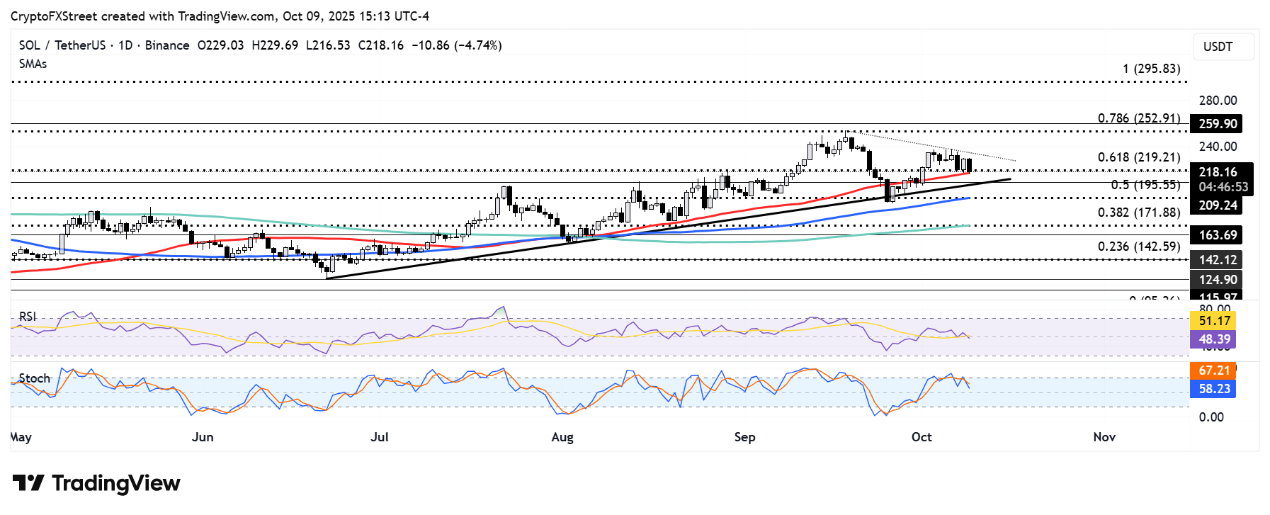 SOL ha bajado un 5% el jueves tras una caída más amplia del mercado de criptomonedas. La altcoin está probando el nivel de retroceso de Fibonacci del 61.8% alrededor de 219$ y la media móvil simple (SMA) de 50 días.